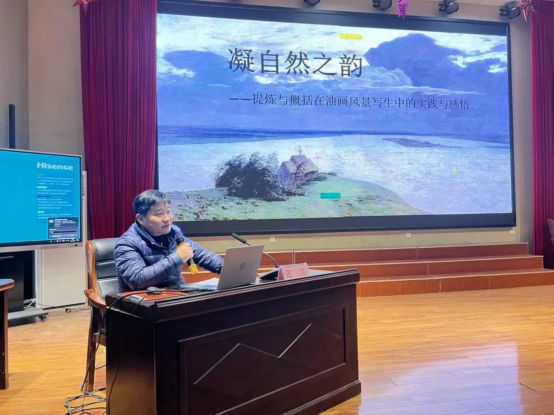 下午,睢宁县高级中学张宝老师给工作室带来讲座《凝自然之韵—提炼与概括在油画风景写生中的实践与感悟》。他结合大量名家作品与自己的写生作品,从立意与观察、构图与截取、形象的简化与归纳、绘画语言的转化与提升等四个方面展开指导。在情感先行、多维观察,主动取舍、经营位置,形象归纳、色调归纳、细节选择,笔触转化、色彩意象化、意境营造等方面分享个人经验。语言诙谐幽默,将专业知识讲解得生动易懂;讲座选取作品风格典型、表现朴素,符合审美视角,教师们在轻松的氛围中掌握了艺术创作的核心技巧,对“提炼自然、概括画面”有了更深刻的理解,从中受益匪浅。