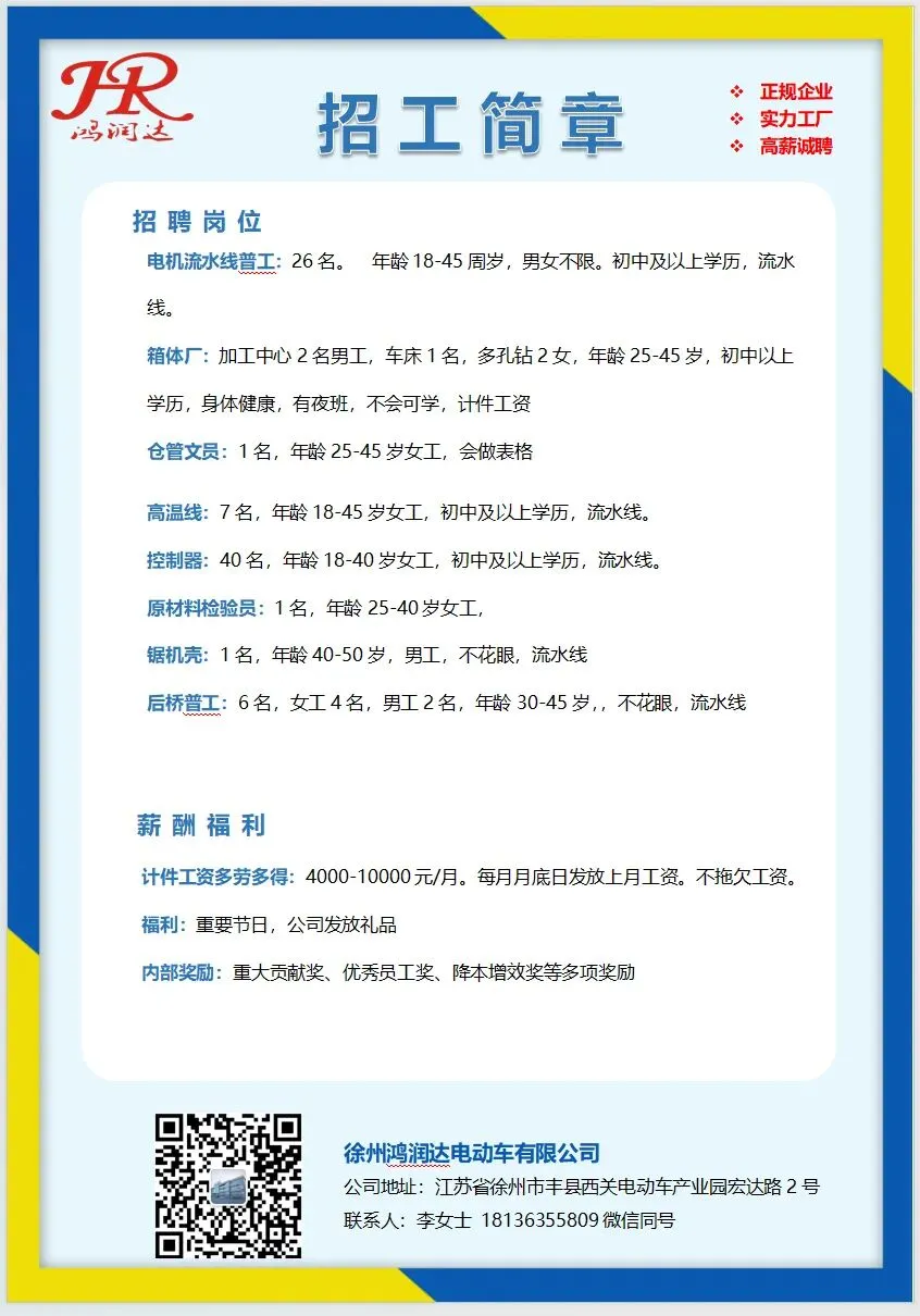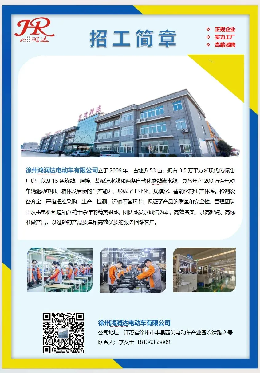 徐州鸿润达电动车有限公司 招工简章