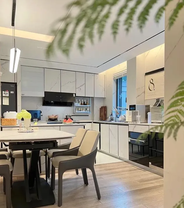 厨房与餐厅之间的24cm厚墙体被彻底拆除,两侧各预留15cm空间,嵌入一张90×180cm的岩板餐桌,动线瞬间打通,从客厅到厨房抬脚即达,通透感翻倍。开放式厨房最棘手的油烟问题,户主用7字型集成灶完美破解,22m³/min的大吸力,即便爆炒辣椒,客厅也闻不到一丝油烟味。吊柜做到顶,最大化利用垂直空间,下沿嵌入手扫感应灯,彻底解决切菜背光的痛点。冰箱嵌入高柜设计,散热口预留于侧面,与橱柜齐平贴合,规整度拉满,强迫症看了都直呼舒适。