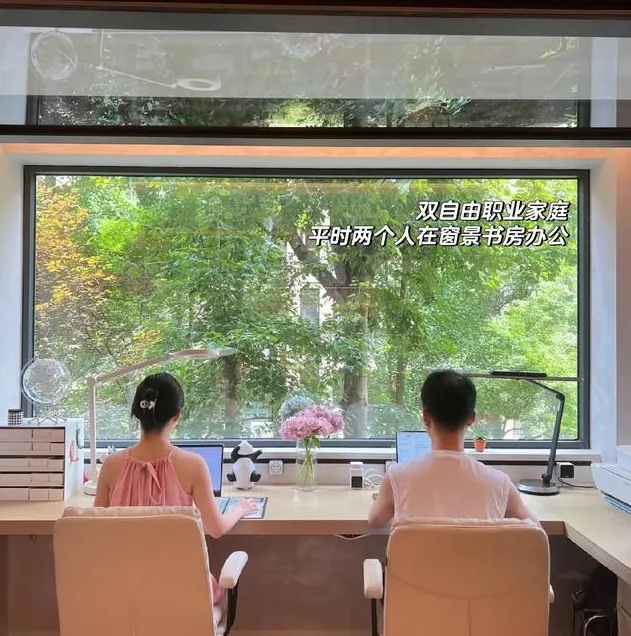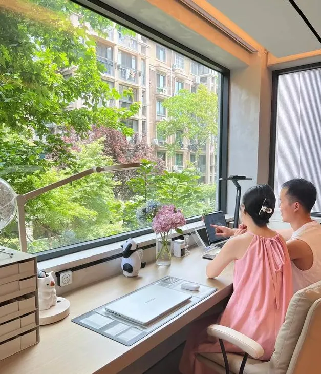 阳台改造成书房,堪称整场改造的神来之笔。原始1.2m高的窗户,被替换成2.4m整面落地窗,视野直接延伸至小区绿化带,冬日阳光洒满全屋,连键盘都带着暖意。定制L型悬浮书桌,尺寸达2m+1.4m,两人同时办公也不拥挤;桌底预留30cm高度,扫地机器人可自由进出,清洁无死角。为应对日晒问题,玻璃贴了TPU高透隔热膜,能阻隔99%的紫外线,书桌搭配实木材质并涂刷木蜡油,即便暴晒三年也不会翘边变形。