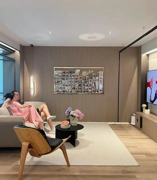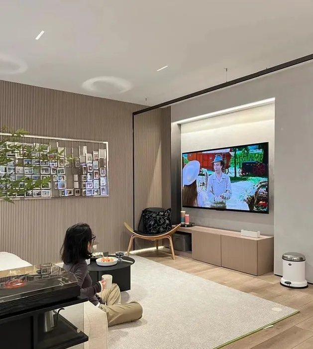客厅改造率先打破局限,拆掉阳台门、撬除原有地砖,换上75×150cm的暖调木纹砖,从客厅通铺至阳台,视觉延展性直接拉满,仿佛凭空拓宽3米。无主灯设计并非盲目跟风,而是适配2.65m层高的最优解:四周吊顶暗藏2.5cm极窄磁吸轨道,搭配24°洗墙射灯,沙发上方增设两盏9W轨道射灯,3000K暖色温开灯后,整个客厅被一层柔和的奶油感包裹,温馨又不压抑。电视墙放弃繁复造型,全程留白,仅预留100寸激光幕布,夜晚降下即是家庭影院,白天收起后墙面整洁通透,每一寸空间都不浪费。