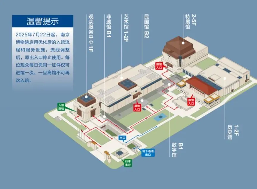 请从正大门入口西侧服务中心安检进馆,从广场或过街通道出馆。流线调整后,原出入口停止使用。每位观众每日凭同一证件仅可进馆一次,一旦离馆不可再次入馆。