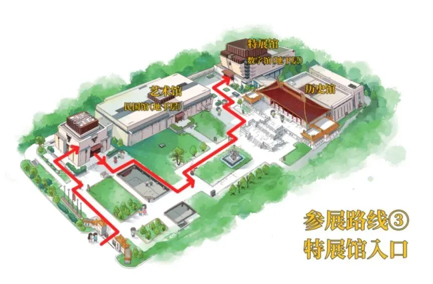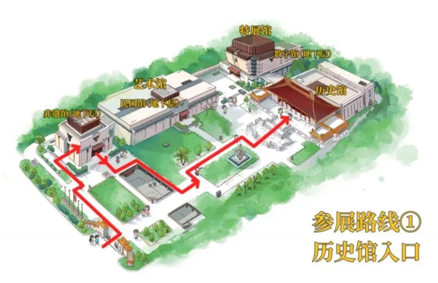 从服务中心安检完毕后,可以自由选择历史馆、艺术馆、特展馆三个进馆入口。