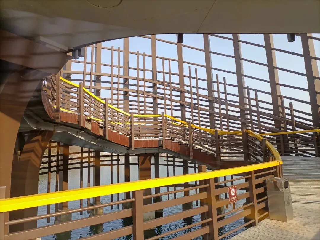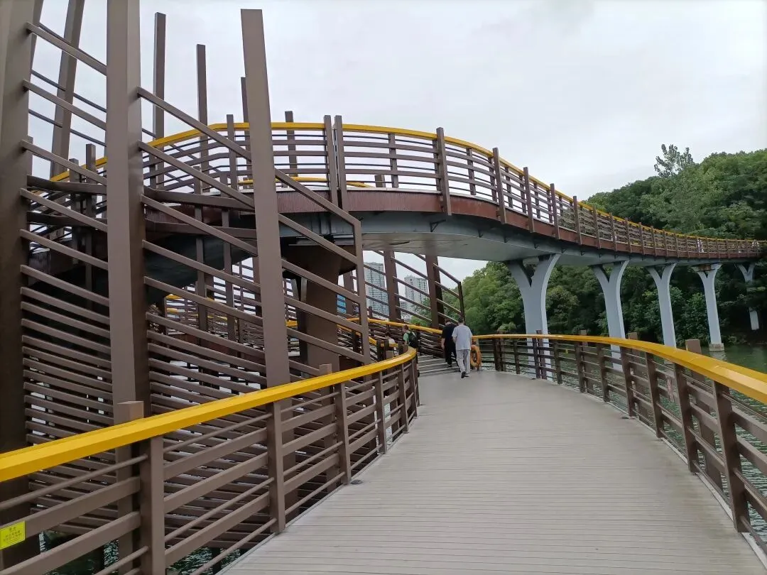 因为新区公园与何山的海拔落差,在湖中心利用螺旋式上升的桥身巧妙地解决了这个问题,游客登桥时一边感叹桥身建设的壮观和新颖性,又带来视觉上的美感和踏足于桥上的那种舒适感,真正体会到“一桥飞架南北,天堑变通途”的含义。站在桥上高低不同的位置,人的视觉触及到的景色会带给人不同的心理感受,我更喜欢站在高处欣赏周边的景色,犹如一个胜利者居高临下的姿态:看,好美的风景!