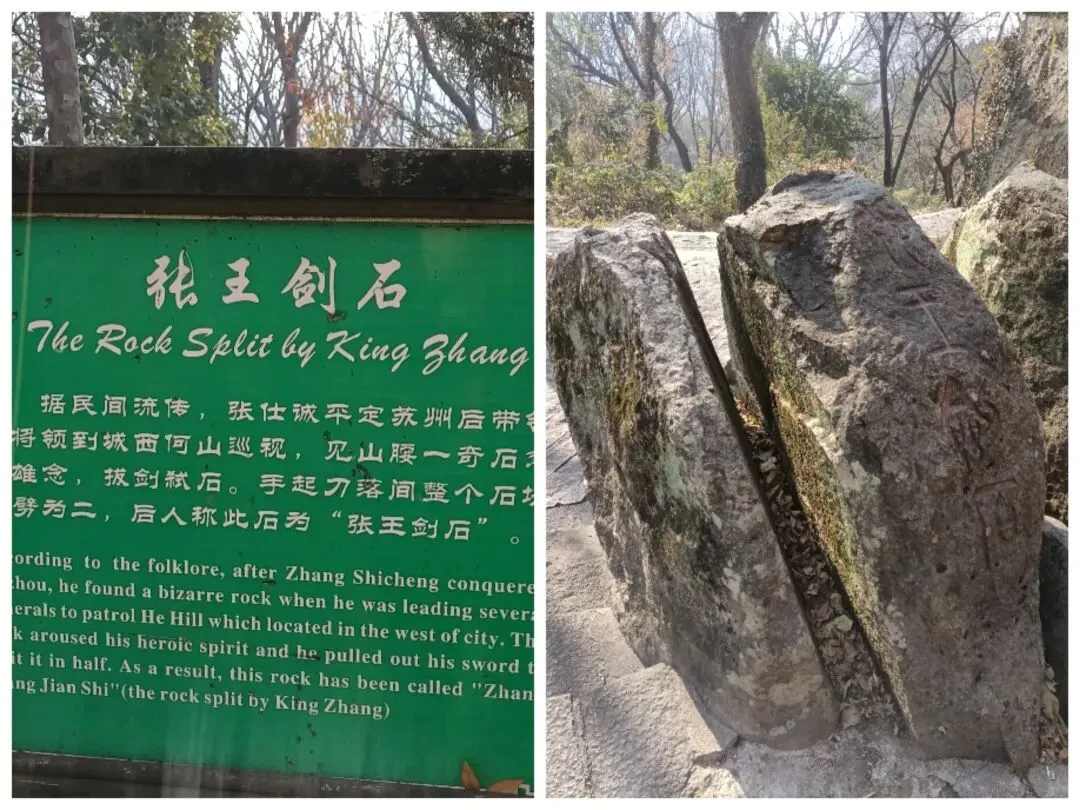 顺着林间的柏油步道慢慢上山,路边隔一段距离有一个十二生肖的小动物,栩栩如生,很是可爱。到了山顶,何山道院建在此处,原是当地老百姓为纪念吴王张士诚而修建的张王庙,2009年改为道教宫观。道院里传来念经颂道的念唱声,一阵阵燃香的气味扑鼻而来。顺着道院墙边的小路直走,路边一块石头被齐刷刷拦腰劈开,据民间流传,张仕诚平定苏州后率众将领来到苏州何山巡视,见路边一奇石,顿起雄念,拔剑试石,手起刀落,这块石头被劈为二。后人称此石为“张王剑石”。