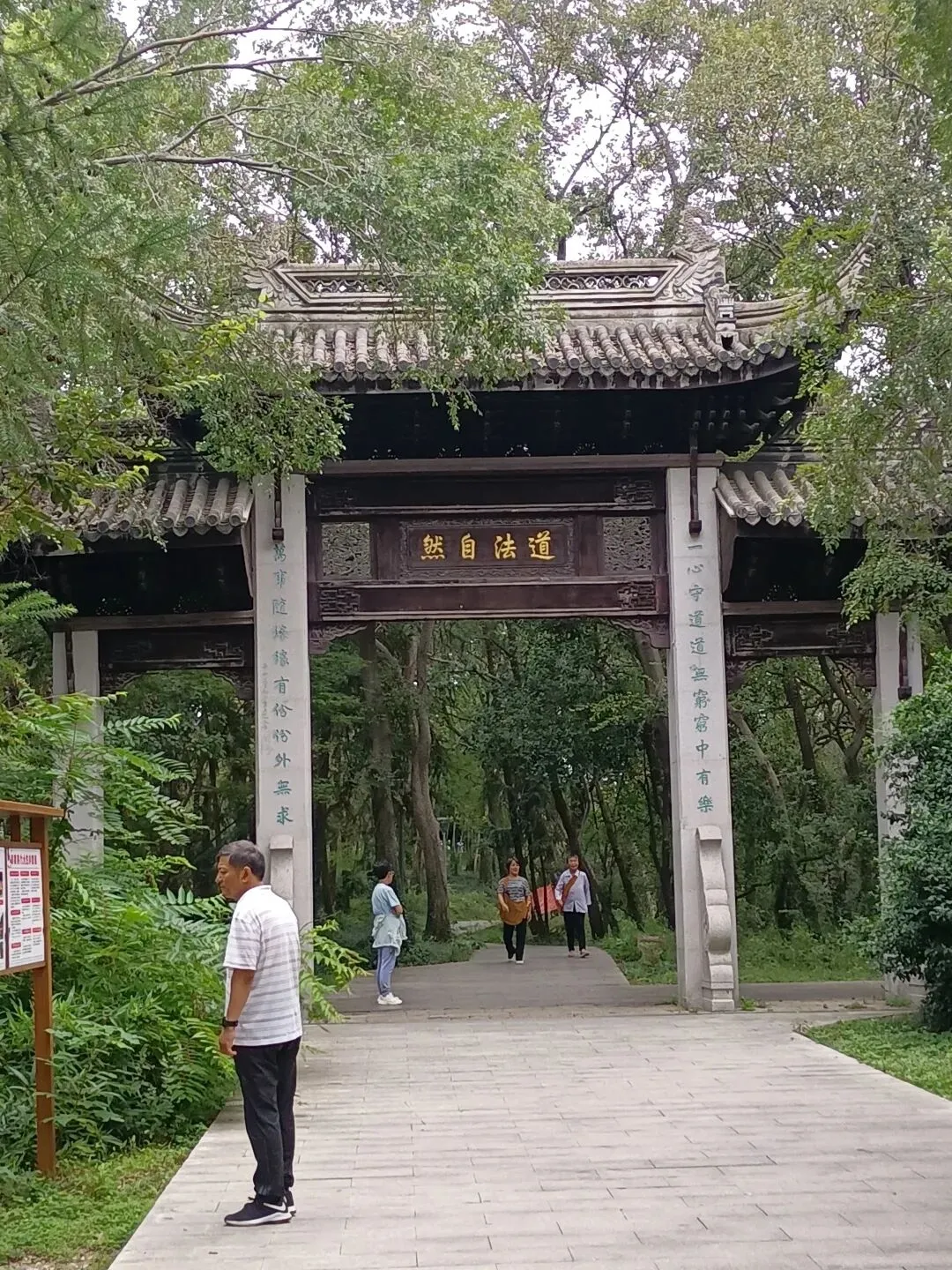 拐弯处来到了何山道院的道场,时不时的有人进道院里烧香拜佛或游览。我顺着门口的路走过去,一处宣传栏里是何山道院简介及道家的九大生存智慧。前面是一古朴高大、飞檐俏角的四柱大门楼,上写“道法自然”四个字,中间两边的柱子上石刻着:一心守道道无窮窮中有乐,万事随缘缘有份份外无求。体现了道家顺其自然、知足常乐的哲学思想。门楼的另一面上写着“鹤阜圣境”,两边柱子上的石刻对联:入真门秉真教参透真玄真自在,登妙境聆妙音顿开妙道妙神通。鹤阜即是何山的原名,这幅对联与前面的对联相呼应,鼓励修行者以真心遵循大道的教诲,领悟参透人生的玄机,最终达到心灵的自由,获得超越常人的智慧和通达。