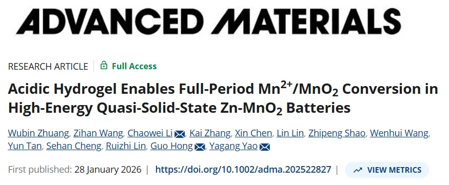 『水系锌电』南京大学团队 Advanced Materials:酸性水凝胶策略,实现高能量准固态锌锰电池全周期 Mn²⁺MnO₂转化