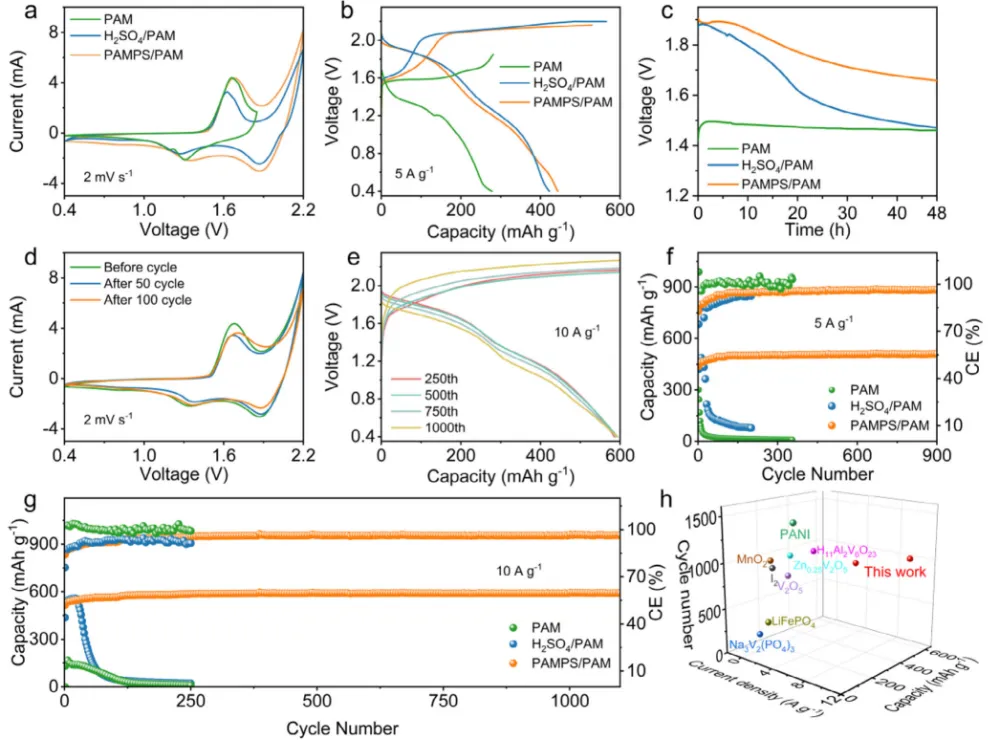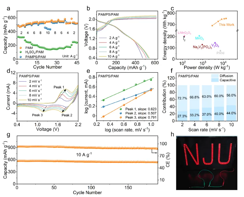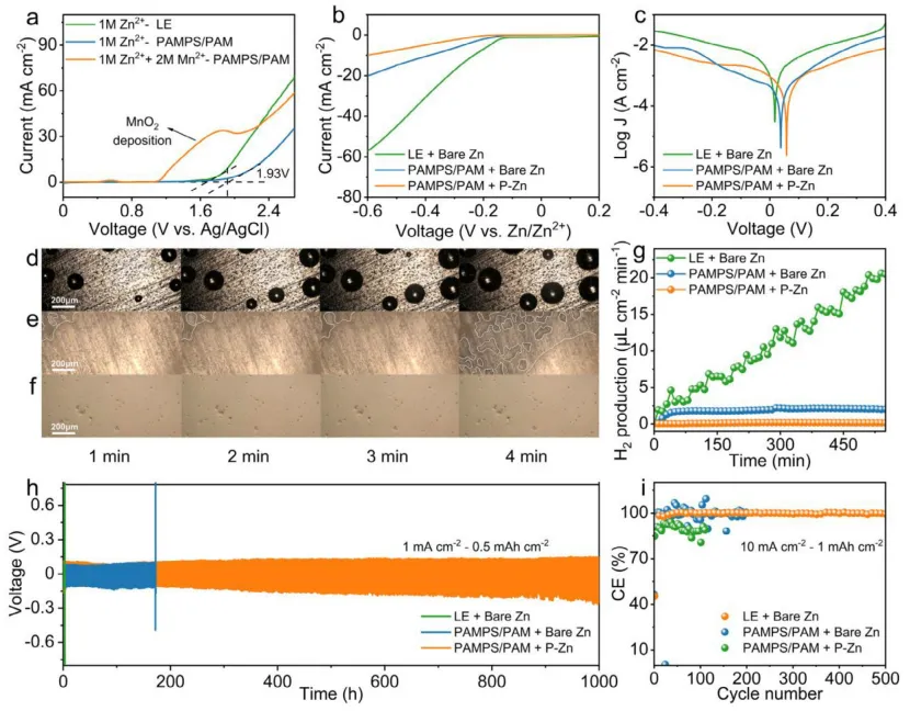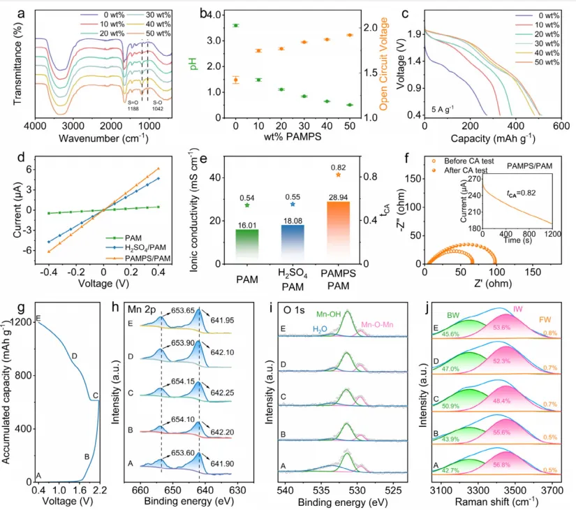 柔性水系锌离子电池(FAZIBs)凭借内在安全性高、成本效益显著等优势,成为下一代便携式和可穿戴电子设备的理想电源候选。然而,其实际应用受限于能量密度偏低,核心症结在于 MnO₂正极利用率不足,仅能发生单电子氧化还原反应。现有研究虽尝试通过酸性电解液激活 Mn²⁺/MnO₂双电子反应以提升能量密度,但面临诸多瓶颈:酸性液体电解液易泄漏、安全性差;传统水凝胶电解液难以维持稳定酸性环境,导致放电电压衰减快;酸性体系下锌负极易发生析氢反应,影响电池循环稳定性。开发兼具稳定酸性环境、高效离子传输与抑制副反应能力的电解质体系,实现全周期可逆的 Mn²⁺/MnO₂双电子转化,是提升 FAZIBs 能量密度与耐久性的关键。现有提升锌锰电池能量密度的策略中,引入小分子酸或 redox 介质可激活双电子反应,但存在电解液稳定性差、反应可逆性不足等问题;传统水凝胶电解质虽能解决泄漏问题,却难以维持长期酸性微环境,导致双电子反应难以持续。本研究设计了一种新型酸性水凝胶电解质(PAMPS/PAM),以聚(2 - 丙烯酰胺 - 2 - 甲基丙磺酸)和聚丙烯酰胺共聚物为基质,构建稳定质子库;同时采用聚合物包覆锌阳极(P-Zn)抑制析氢反应。该策略通过水凝胶的质子调节能力与包覆阳极的副反应抑制作用,实现了全周期 Mn²⁺/MnO₂双电子转化,使电池在 10 A g⁻¹ 下容量达 592.9 mAh g⁻¹,能量密度 762.6 Wh kg⁻¹,循环 1000 次容量保持率 99.1%,为高能量柔性水系锌离子电池的研发提供了新路径。①电解质设计创新:提出 PAMPS/PAM 酸性水凝胶电解质,通过磺酸基团(-SO₃H)构建动态质子库,实现循环过程中质子的稳定供给与平衡,持续激活 Mn²⁺/MnO₂双电子反应;②界面调控创新:PAMPS/PAM 中的 - SO₃⁻基团通过静电作用构建高效阳离子传输通道,同时 P-Zn 阳极通过双层聚合物涂层隔绝质子与锌金属接触,显著抑制析氢反应与锌腐蚀;③性能突破:电池放电电压达 1.9 V,能量密度与功率密度分别高达 762.6 Wh kg⁻¹ 和 13821.8 W kg⁻¹,1000 次循环后容量保持率 99.1%,纤维状电池展现出优异的柔性与实际应用潜力。图1 基于 PAMPS /PAM的Zn||二氧化锰电池的优势。图2:PAMPS/PAM 水凝胶结构、质子调节能力及电池反应机制图2. (a) 不同 AMPS 含量的 PAMPS/PAM 水凝胶 FTIR 光谱;(b) 前驱体溶液 pH 与组装电池开路电压(OCV);(c) 不同水凝胶电解质的电池充放电曲线;(d) 水凝胶 I-V 特性曲线;(e) 离子电导率与阳离子迁移数;(f) Zn//Zn 对称电池极化曲线与阻抗谱;(g) PAMPS/PAM 基电池第二次充放电曲线;(h) 准原位 XPS Mn 2p 谱;(i) 准原位 XPS O 1s 谱;(j) 水凝胶中水分子 Raman 光谱拟合。系统阐明了 PAMPS/PAM 水凝胶的质子调节机制与双电子反应激活原理:①水凝胶中磺酸基团的引入显著降低体系 pH(10 wt% AMPS 时 pH 降至 1.41),为 Mn²⁺/MnO₂双电子反应提供必要酸性环境,随着 AMPS 含量增加,电池 OCV 从 1.4 V 提升至 1.9 V;② FTIR 与 NMR 表征证实磺酸基团成功接枝到水凝胶网络,其 - SO₃H 基团可可逆结合与释放质子,充放电过程中通过氢键网络重构(键合水 / 自由水比例变化)实现质子动态平衡;③准原位 XPS 与 Raman 测试验证,循环过程中 Mn 价态在 Mn²⁺与 Mn⁴⁺间可逆转变,水分子存在动态质子交换,证实双电子反应的高可逆性。图3:水凝胶电化学稳定性与 P-Zn 阳极析氢抑制效果图3. (a) 不同电解液的氧析出反应 (OER) 曲线;(b) 不同电极 / 电解液体系的析氢反应 (HER) 曲线;(c) 塔菲尔曲线;(d-f) 原位光学显微镜观察析氢行为:(d) 液体电解液 + 裸锌,(e) PAMPS/PAM + 裸锌,(f) PAMPS/PAM+P-Zn;(g) 析氢量随时间变化曲线;(h) Zn//Zn 对称电池循环稳定性;(i) Zn//Cu 不对称电池库仑效率。深入解析了 PAMPS/PAM 水凝胶的电化学稳定性与 P-Zn 阳极的副反应抑制作用:① LSV 测试表明,PAMPS/PAM 水凝胶的 OER 起始电位达 1.93 V,显著高于聚合前液体电解液(1.68 V),电化学稳定窗口有效拓宽,可兼容 MnO₂电沉积过程;② HER 测试与原位观察证实,P-Zn 阳极通过双层聚合物涂层阻挡质子与锌表面直接接触,析氢电流密度显著降低,析氢量较裸锌体系大幅减少;③ Zn//Zn 对称电池在 1 mA cm⁻²、0.5 mAh cm⁻² 条件下循环 1000 h 仍稳定,而裸锌在液体电解液中仅循环 3.5 h 即失效;Zn//Cu 电池 500 次循环平均库仑效率达 99.29%,证实锌沉积 / 剥离的高可逆性。图4. (a) 不同水凝胶电解质的 CV 曲线;(b) 充放电曲线;(c) 48 h 静置后的 OCV 变化;(d) 循环 0、50、100 次后的 CV 曲线;(e) 特定循环次数的充放电曲线;(f) 5 A g⁻¹ 下的库仑效率与容量保持率;(g) 10 A g⁻¹ 下的循环性能;(h) 与已报道电池的性能对比。全面验证了 PAMPS/PAM-P-Zn 体系对电池性能的提升效果:① CV 曲线显示,PAMPS/PAM 基电池在 1.87 V 附近出现明显还原峰,1.9-2.2 V 出现氧化峰,对应 Mn²⁺/MnO₂双电子转化,而纯 PAM 水凝胶电池仅呈现单电子反应特征峰;②充放电曲线表明,PAMPS/PAM 基电池具有 1.9 V 的高放电平台,且该平台在不同循环次数中持续保持,而 H₂SO₄/PAM 体系电压逐渐衰减;③长期循环测试显示,电池在 5 A g⁻¹ 下循环 900 次容量达 511.4 mAh g⁻¹,10 A g⁻¹ 下循环 1000 次容量保持 592.9 mAh g⁻¹,容量保持率 99.1%,性能优于多数已报道水凝胶基锌离子电池。图5. (a) 不同电流密度下的倍率性能;(b) 不同电流密度的充放电曲线;(c) 能量密度与功率密度 Ragone 图;(d) 不同扫描速率的 CV 曲线;(e) log (i)-log (v) 线性拟合;(f) 电容贡献与扩散贡献占比;(g) 纤维状电池循环稳