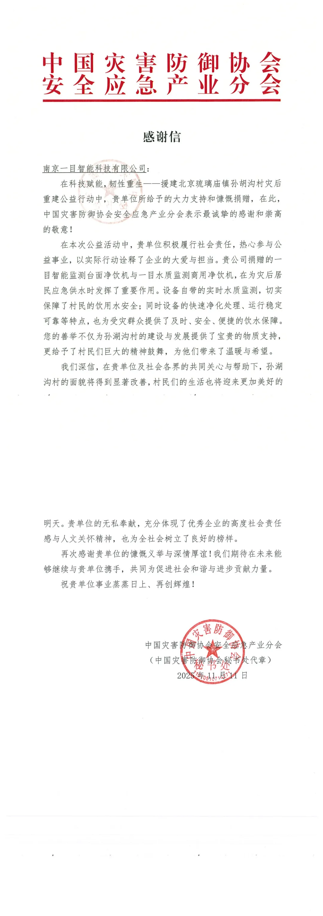 会员感谢信 | 再次感谢:南京一目智能科技有限公司在“科技赋能 韧性重生—援建北京琉璃庙镇孙胡沟村灾后重建公益行动”的慷慨义举