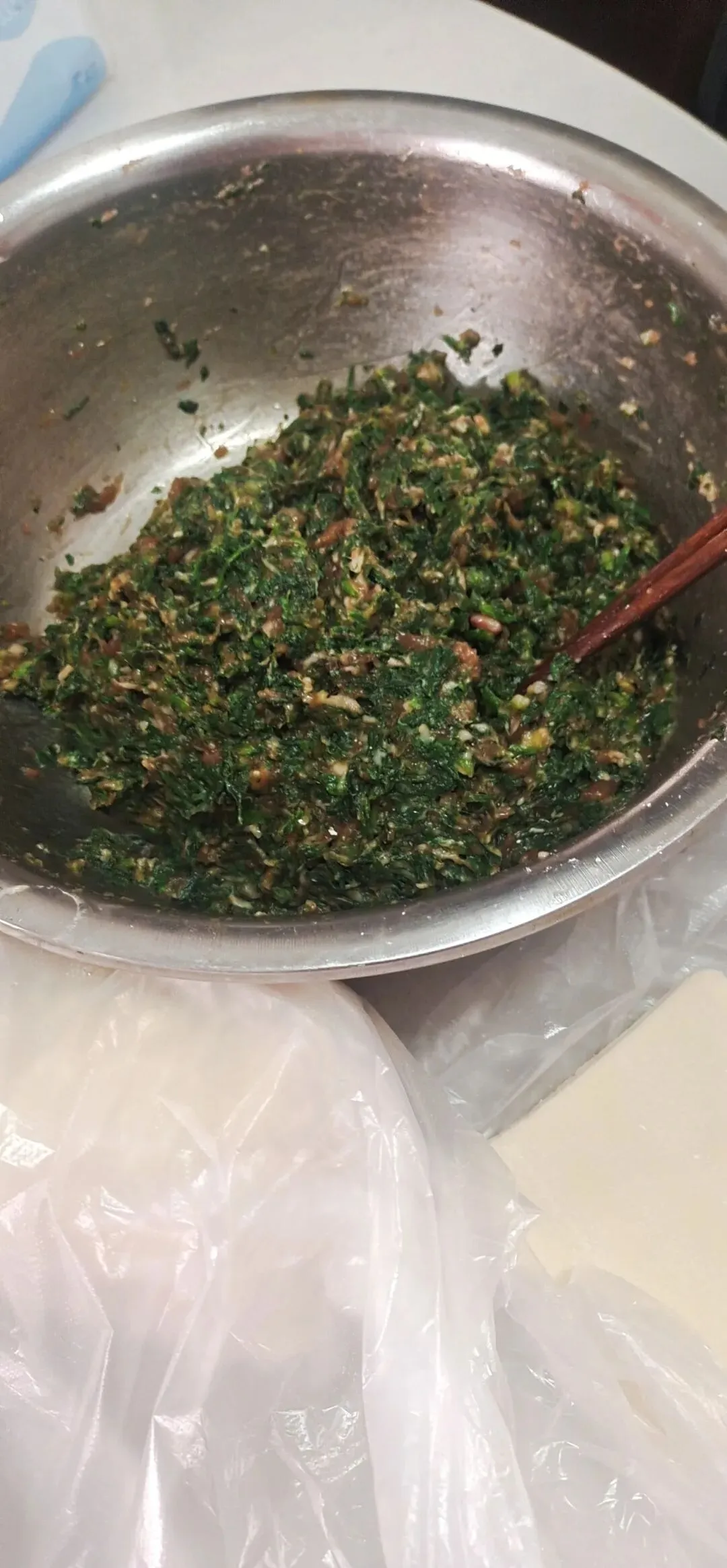 呵呵还可以吧,我这是,食材,就是猪肉,还有新鲜的,野生荠菜,加点,生姜,豪油,放点六味轩,四枚鸡蛋,搅拌均匀,即可,开包,