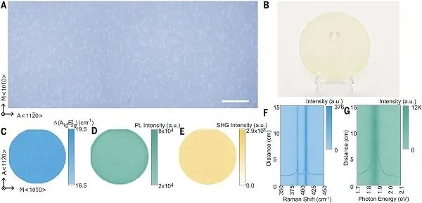 图4 六英寸单晶MoS2晶圆的均匀性表征 ©2026 AAAS