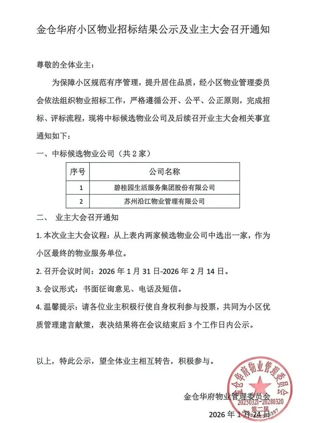 业主大会投票预计于2月14日结束,届时金仓华府可能将会迎来第四任物业。