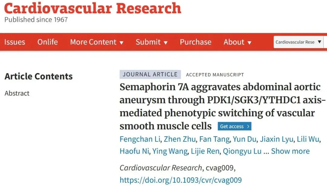 2026年1月19日,苏州大学朱力教授/唐朝君研究员课题组在Cardiovascular Research杂志发表题为“Semaphorin 7A aggravates abdominal aortic aneurysm through PDK1/SGK3/YTHDC1 axis-mediated phenotypic switching of vascular smooth muscle cells”的研究性论文,该研究系统揭示了SEMA7A在腹主动脉瘤发生发展中的关键致病作用及其分子调控机制。