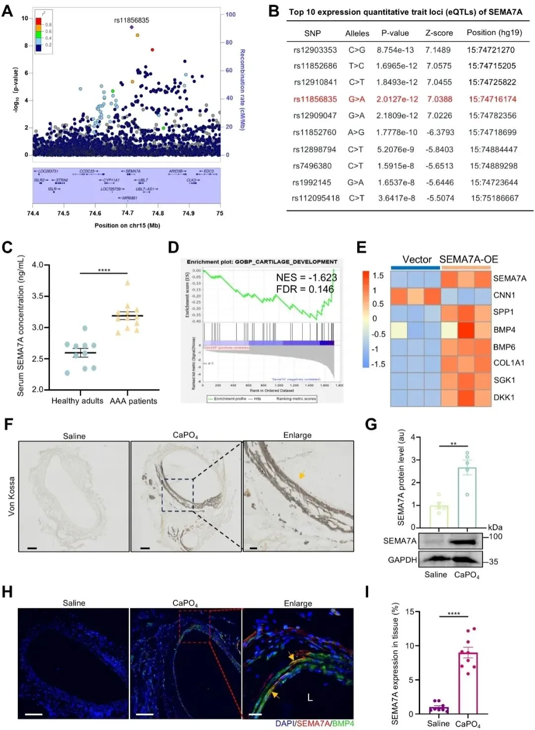 研究首先从遗传学和临床样本层面证实了SEMA7A与腹主动脉瘤的密切关联。GWAS分析显示,SEMA7A基因位点的遗传变异与腹主动脉瘤显著相关。临床样本分析进一步发现,腹主动脉瘤患者血清中SEMA7A水平明显升高。功能层面上,SEMA7A过表达可激活与血管钙化相关的转录程序,上调多种钙化相关因子。在CaPO4诱导的小鼠腹主动脉瘤模型中,SEMA7A在病变主动脉中显著上调,并与钙化相关分子在病灶区域呈现明显共定位,提示SEMA7A可能参与腹主动脉瘤的发生和进展。