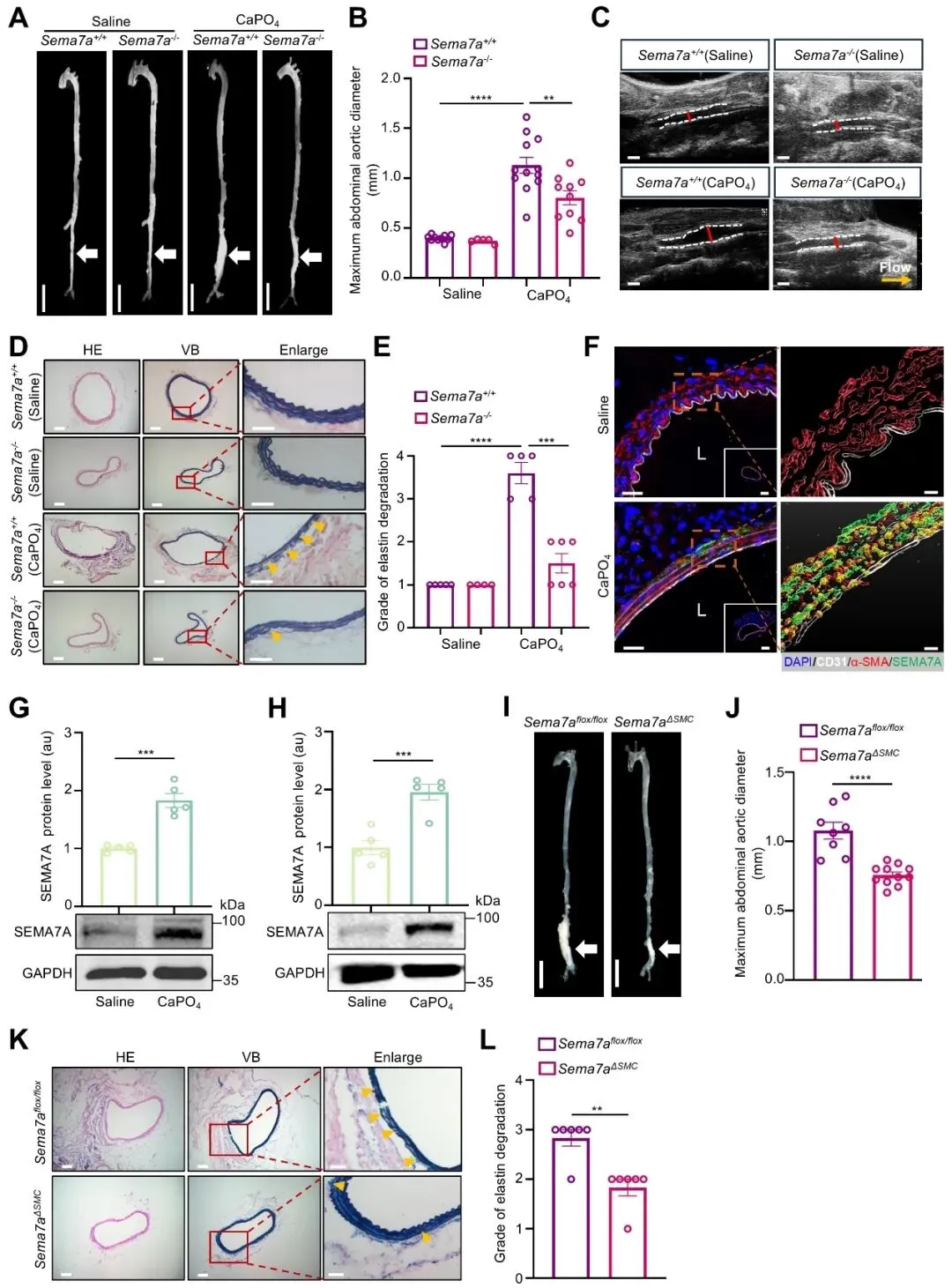 在功能验证中,SEMA7A全身缺失显著减轻CaPO4诱导的小鼠腹主动脉瘤扩张,改善血管壁结构并减少弹力纤维断裂。组织定位分析显示,SEMA7A主要表达于血管平滑肌细胞,进一步通过小鼠特异性敲除模型发现,仅当SEMA7A在血管平滑肌细胞中缺失时,腹主动脉瘤的形成和进展才得到显著抑制,而内皮细胞或髓系细胞中特异性缺失并未产生明显影响。