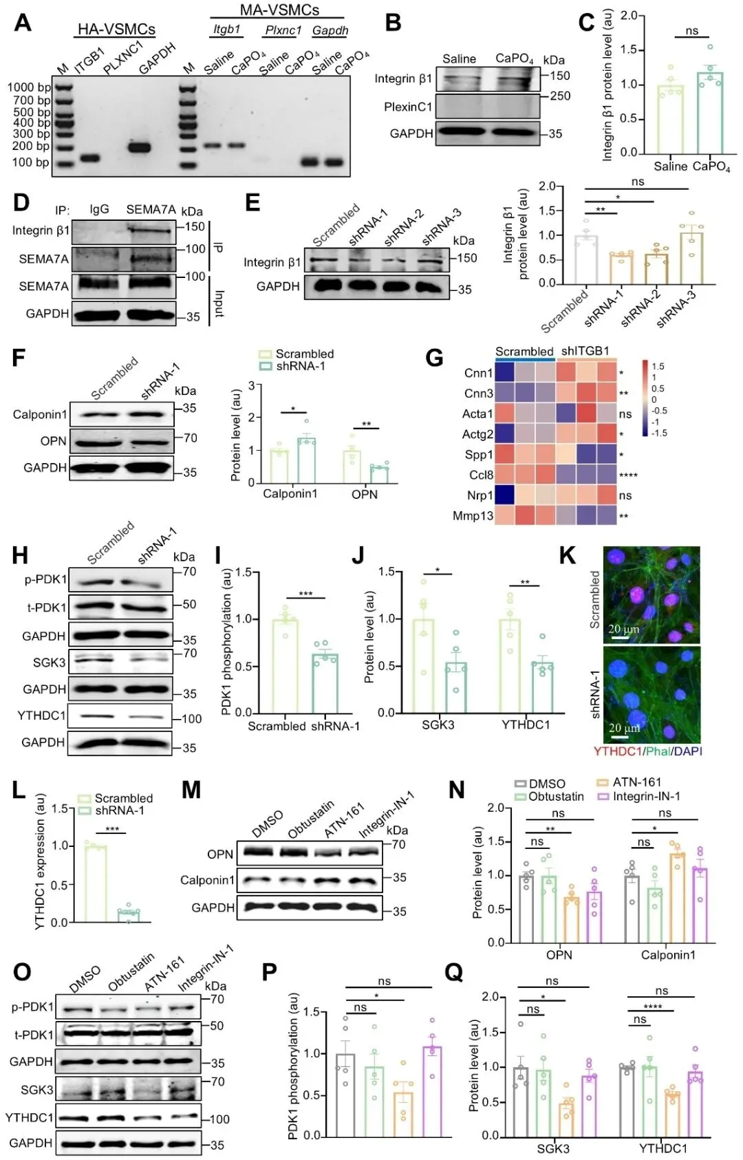 在机制层面,研究重点揭示了SEMA7A介导的integrinα5β1/PDK1/SGK3/ YTHDC1信号轴在血管平滑肌细胞表型调控中的核心作用。研究发现,SEMA7A主要通过与integrin α5β1相互作用,激活PDK1并进一步上调SGK3和m⁶A阅读蛋白YTHDC1,从而驱动平滑肌细胞由收缩型向合成型表型转化。阻断integrin α5β1或干预SGK3和YTHDC1信号可显著抑制该表型转化过程。