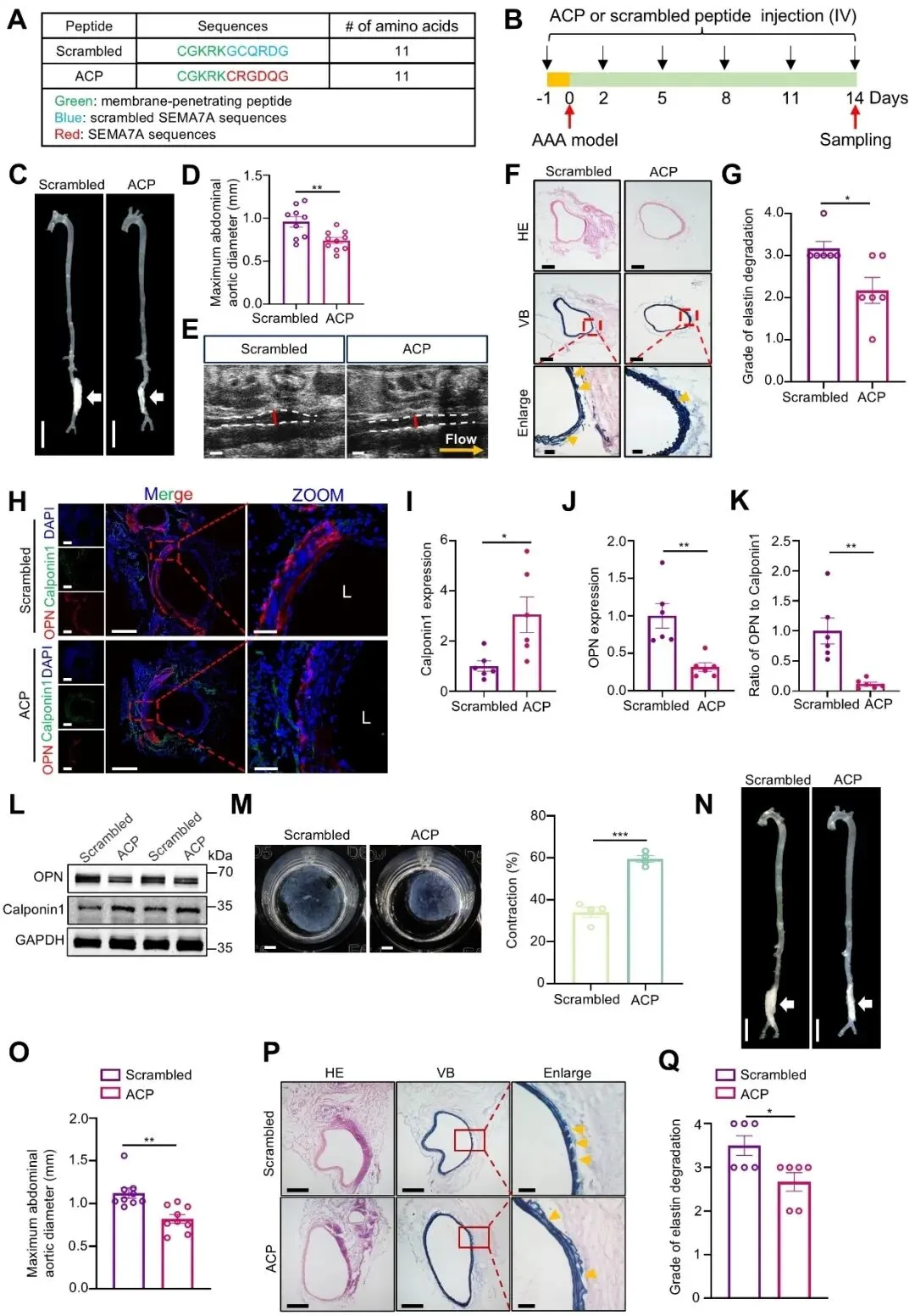 在干预实验中,课题组评估了靶向SEMA7A与integrinα5β1相互作用的治疗潜力。研究团队设计并合成了含RGD基序的SEMA7A抑制肽(ACP),用于竞争性阻断SEMA7A与integrinα5β1的结合。体内实验显示,无论在预防还是治疗给药模式下,ACP均可显著抑制CaPO4诱导的小鼠腹主动脉瘤扩张,改善血管壁结构并减轻弹力纤维破坏。目前,该多肽药物已获得国家发明专利授权(ZL 2024 1 1267695.X)。