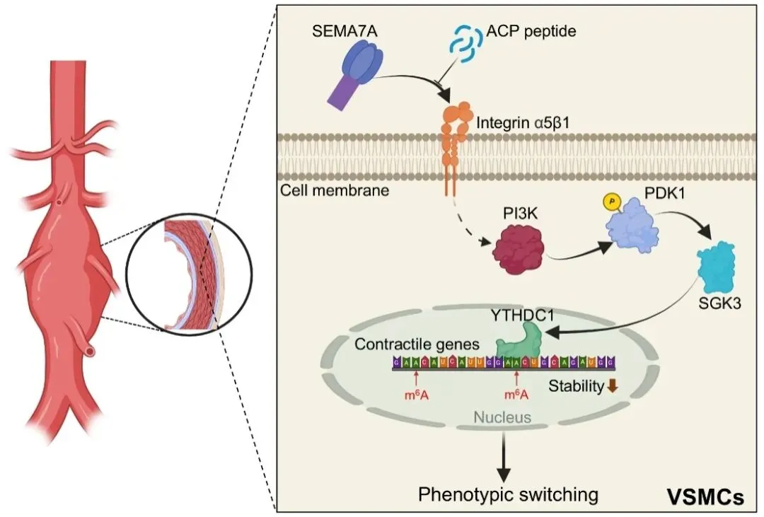 综上所述,本研究首次系统阐明了SEMA7A介导的integrin α5β1/PDK1/ SGK3/YTHDC1信号轴在血管平滑肌细胞表型转化及腹主动脉瘤进展中的关键作用,并提出靶向SEMA7A的干预策略作为AAA防治的潜在新方向,为相关机制研究和药物开发奠定了理论基础。