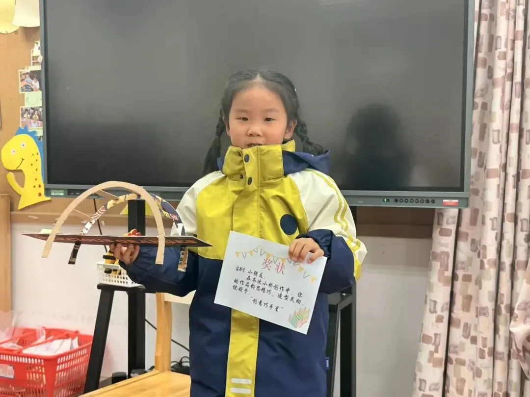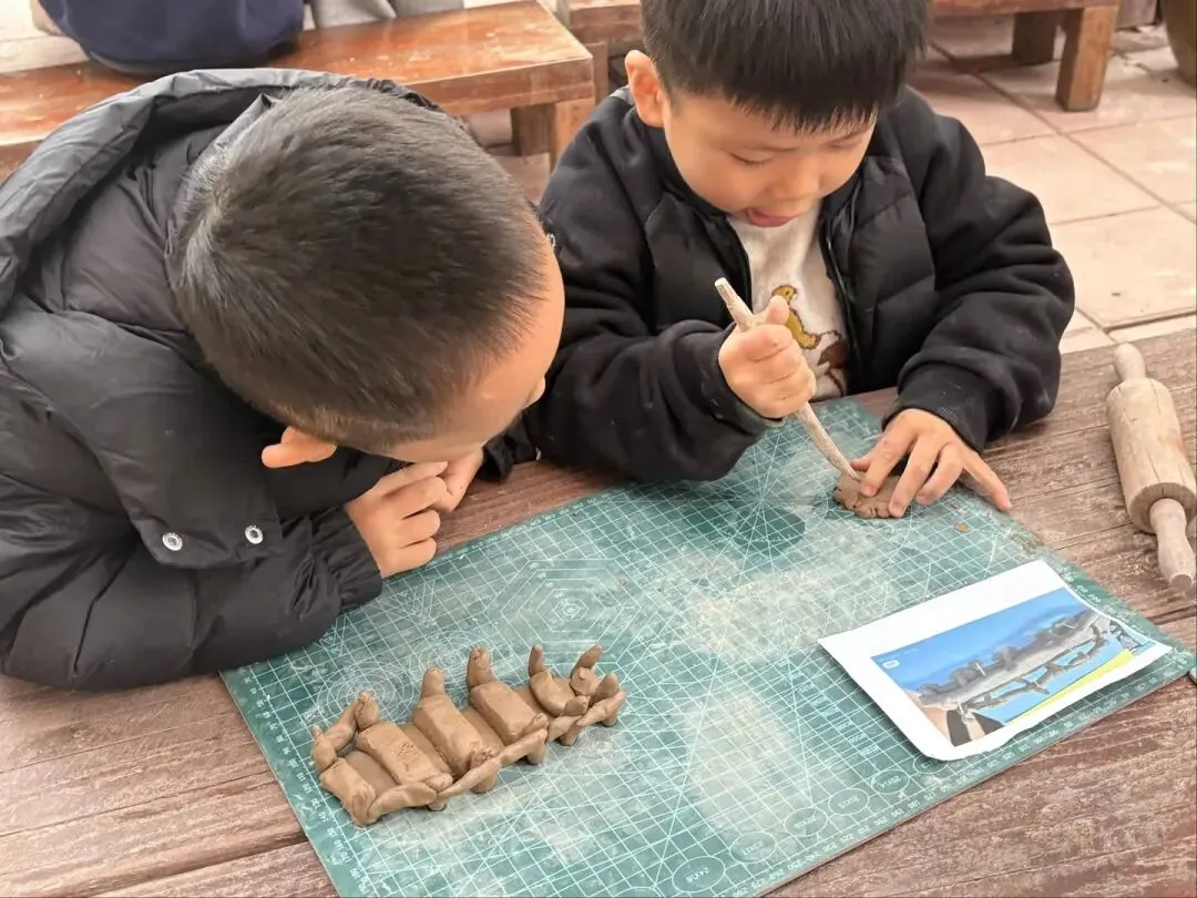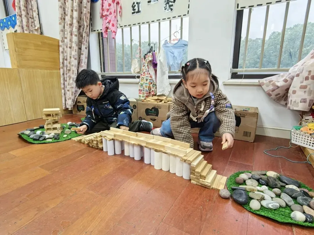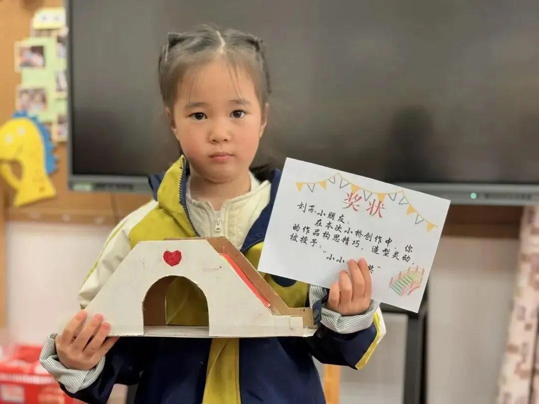 艺术创作时间到!用水墨渲染古桥的温婉,用陶泥捏出桥的轮廓,用筷子搭成小竹桥,用布片贴出桥的模样……建构区里,积木、纸杯、鹅卵石都变成了建桥材料。户外游戏时,孩子们也成了“小小工程师”!