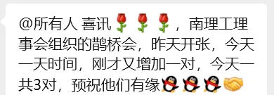 第三对牵线故事尤为动人。一位93年出生的女孩,其父母均为南理工84级校友,与“鹊桥会”发起人之一金文萍校友是同窗好友。“鹊桥会”成立当晚八点三十六分,女孩母亲得知后,立刻联系确认:“是你在做这件公益吗?我们正为女儿的终身大事着急。”