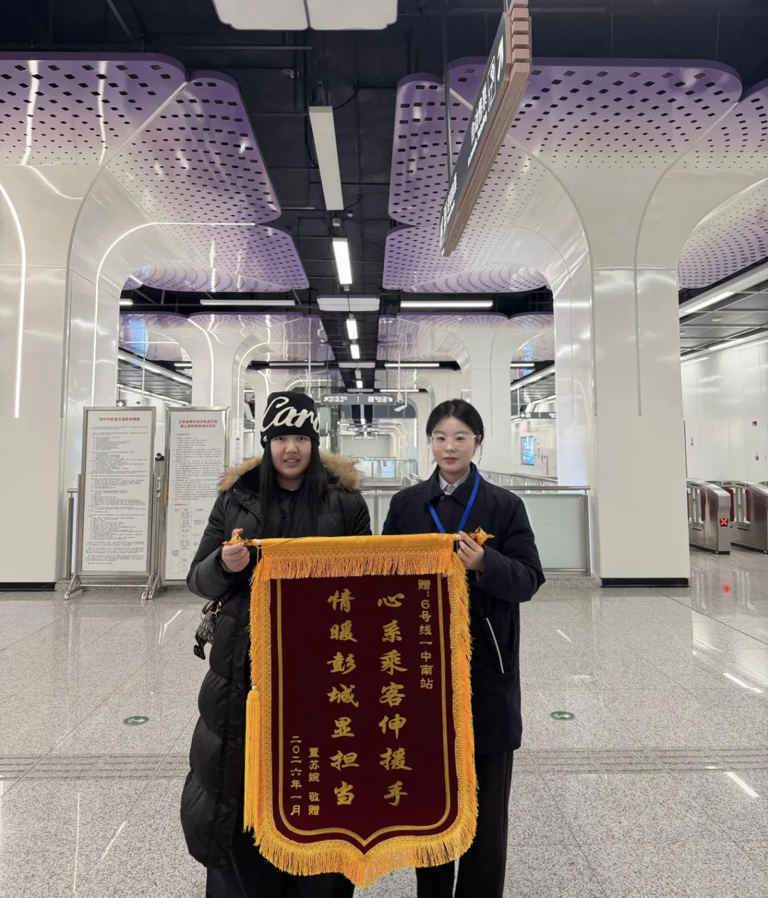 2026年1月26日,市民董女士专程前往徐州地铁6号线一中南站,将一面印着“心系乘客伸援手,情暖彭城显担当”的锦旗,郑重递交至车站值班站长手中,向车站工作人员此前的暖心帮助表达谢意。