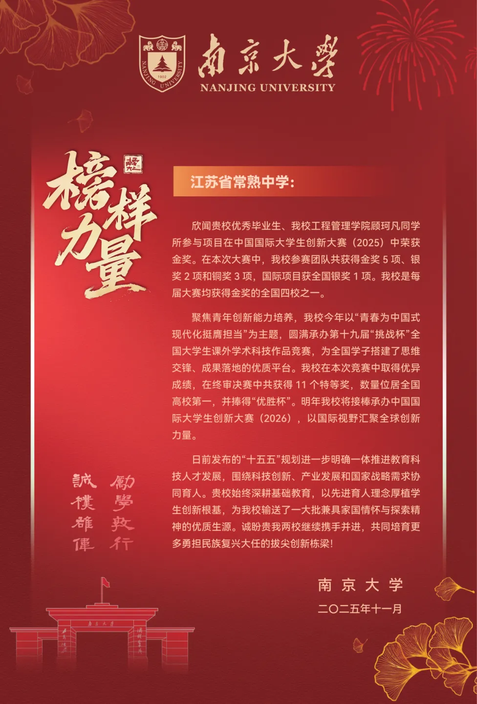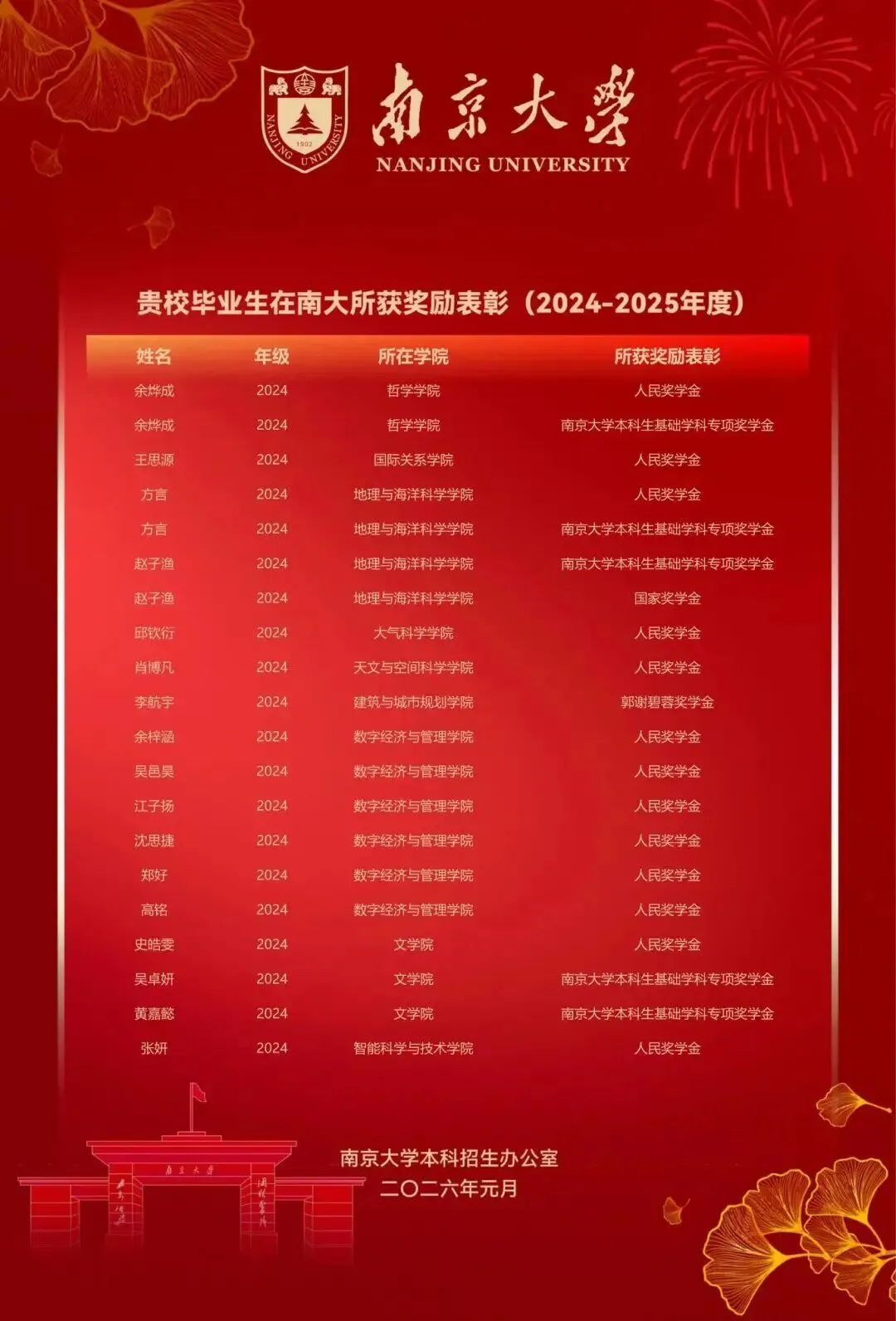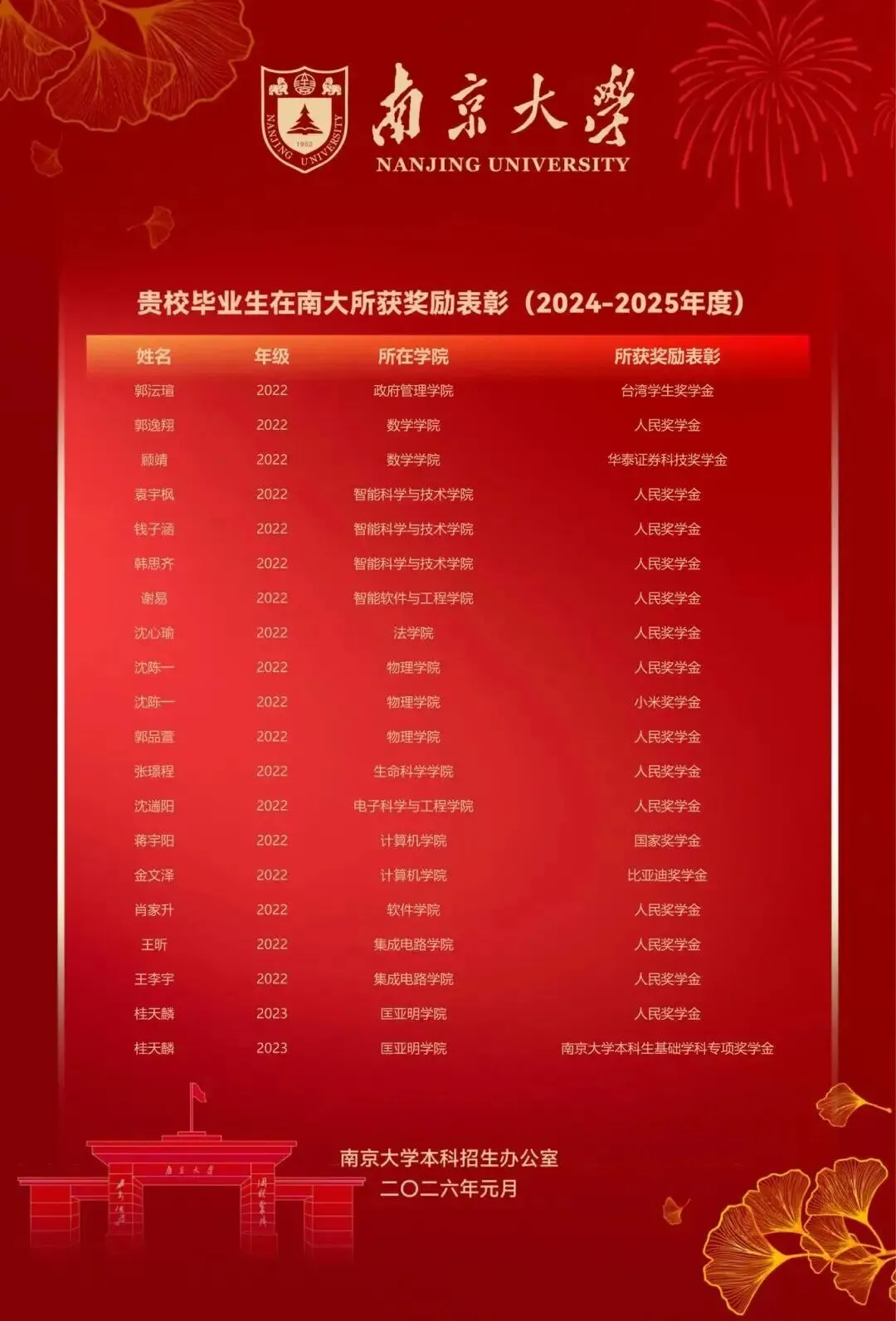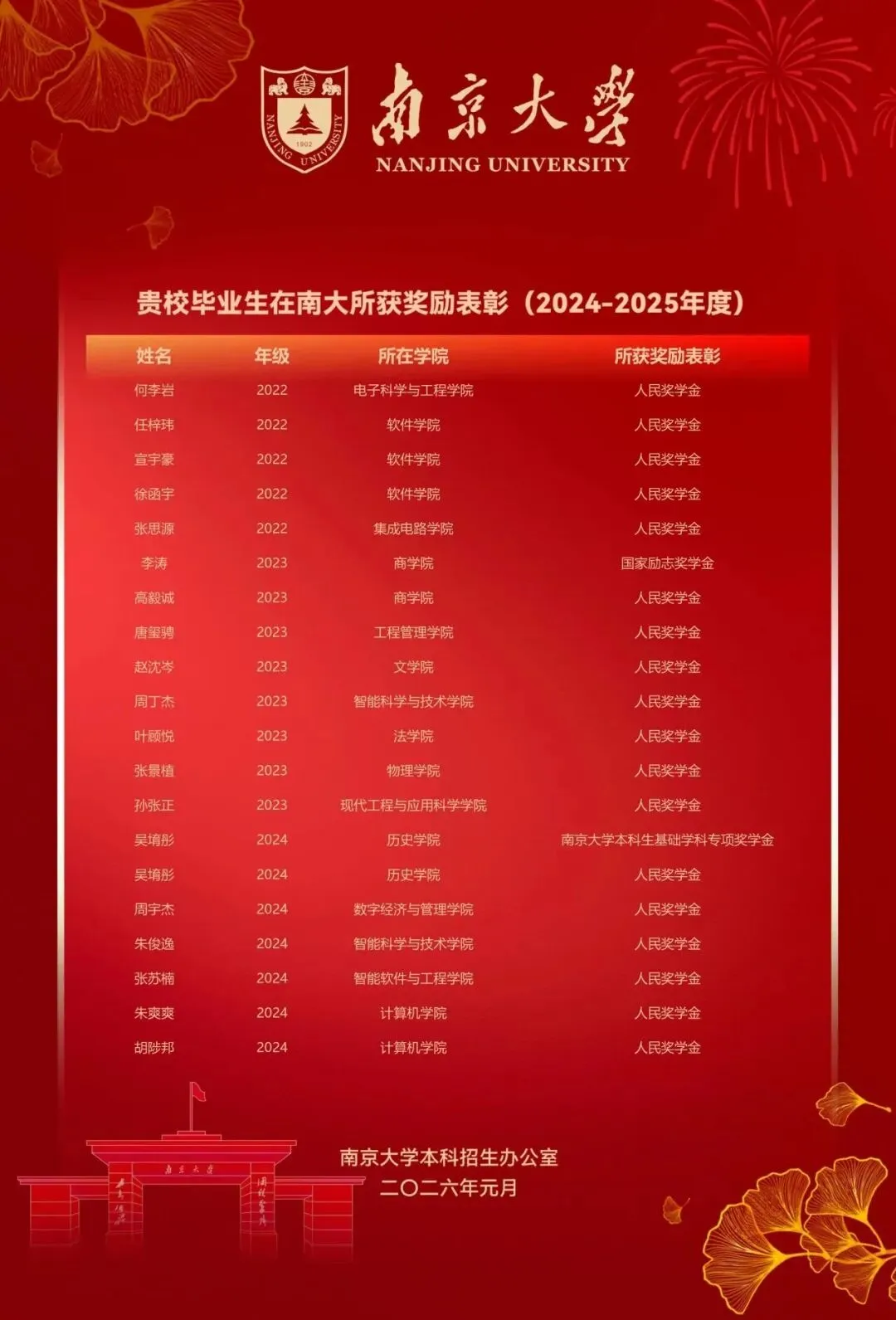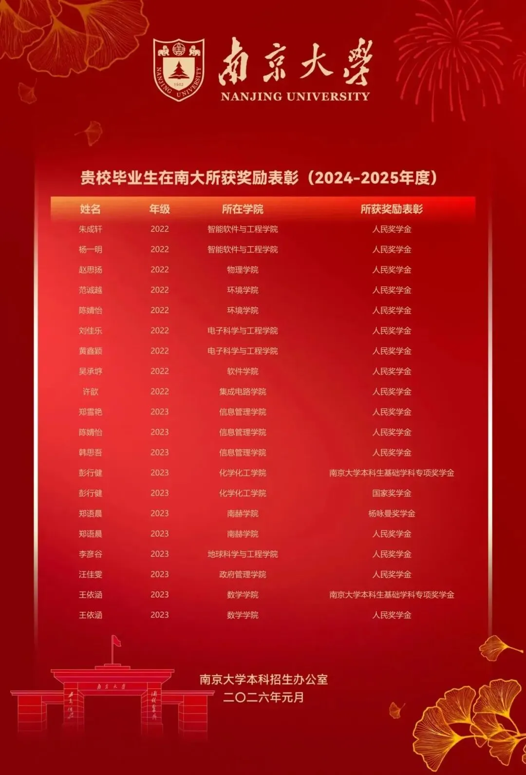 深耕厚植,育木参天。南京大学向我校传来喜报,祝贺我校毕业学子铭记母校殷殷嘱托在南大求学期间诚朴雄伟、励学敦行,斩获多项表彰与佳绩,感谢我校持续为南京大学输送一批批品端成梁、学粹至丰的优秀梁丰学子。期盼两校继续紧密携手、深化协作,共担为党育人、为国育才的时代使命,并肩培育时代所需之卓越栋梁。