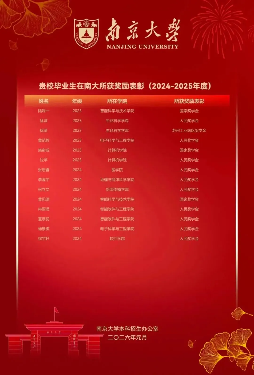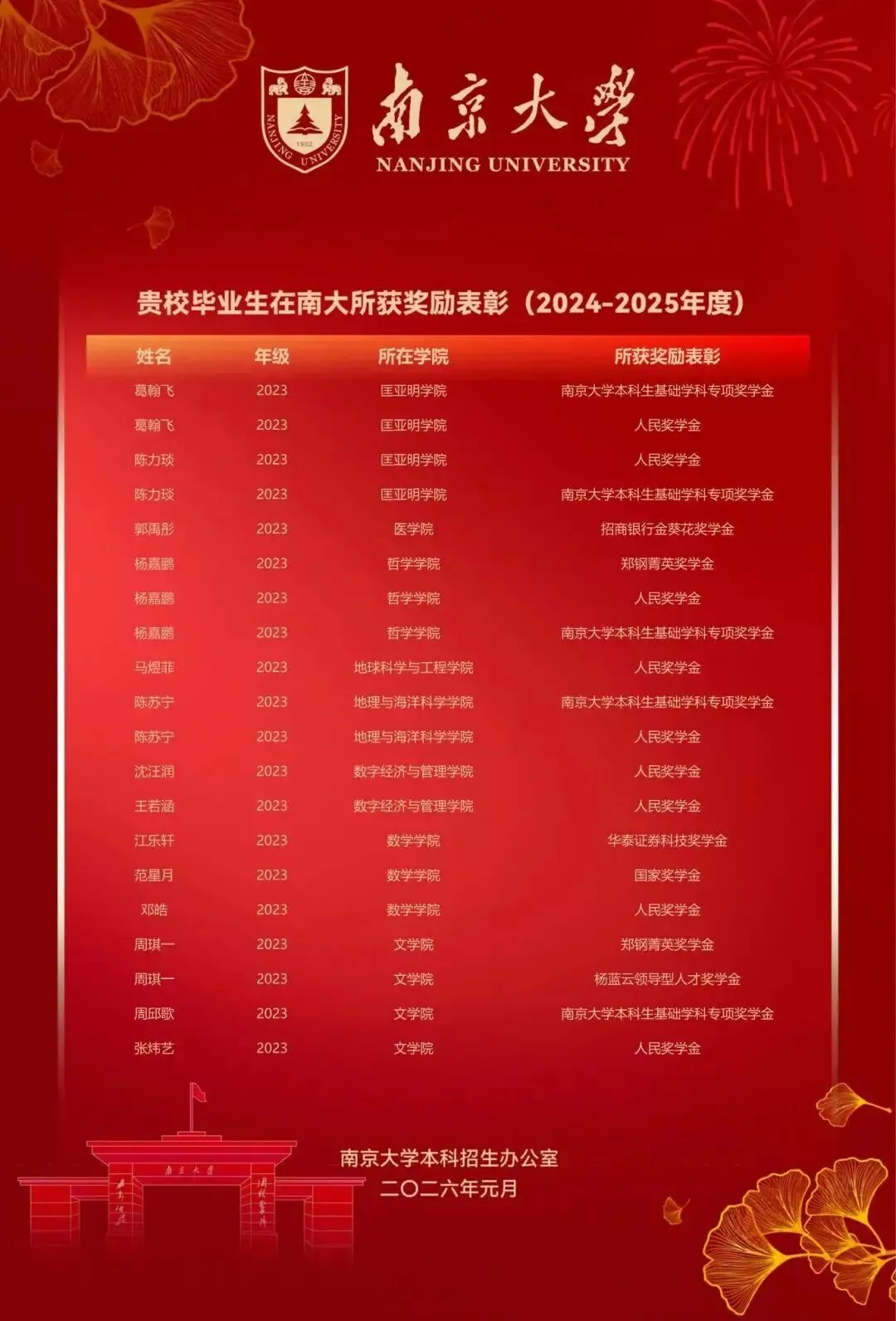 近日,南京大学向我校发来喜报。祝贺我校学子在校期间刻苦学习、锐意进取、全面发展,获得国家和学校的嘉奖,在升学等方面屡创佳绩,期待与我校携手奋进,深化合作,共育时代英才。