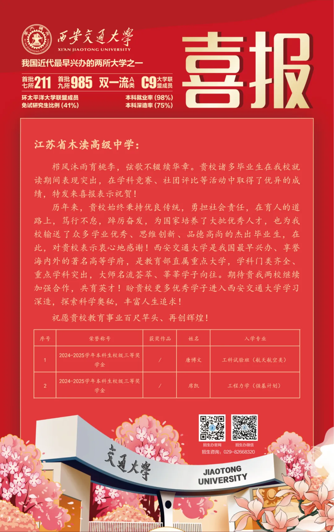冬蕴华章,瑞雪呈祥。在这辞旧迎新的美好时刻,江苏省木渎高级中学捷报频传,南京大学、西安交通大学两所顶尖学府相继发来喜报,为寒冬注入融融暖意。