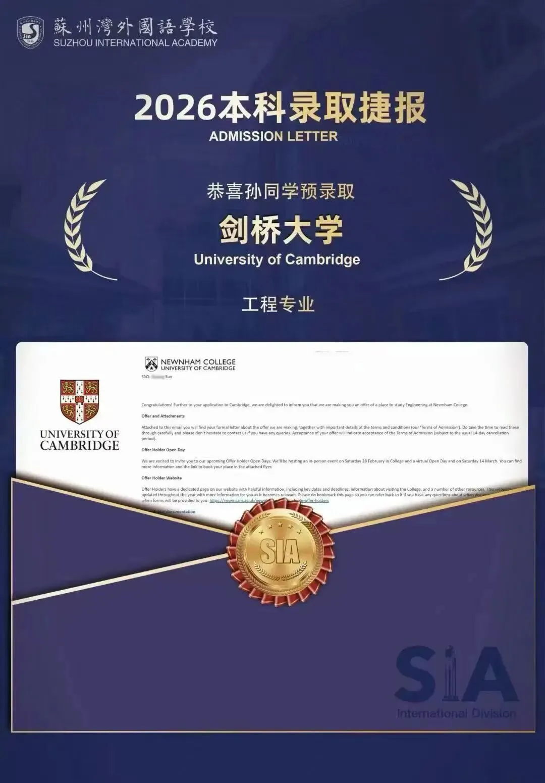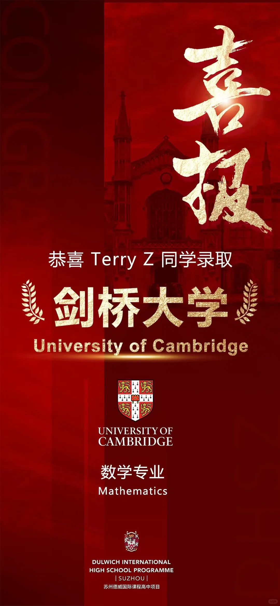 剑桥大学将确认申请的最终决定。