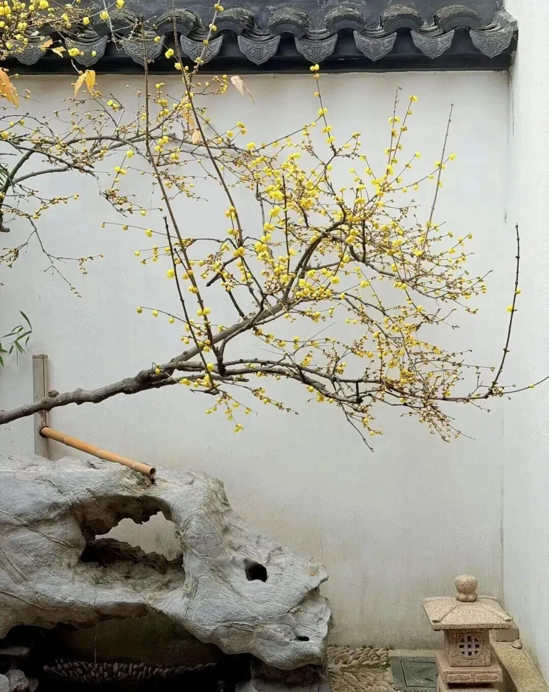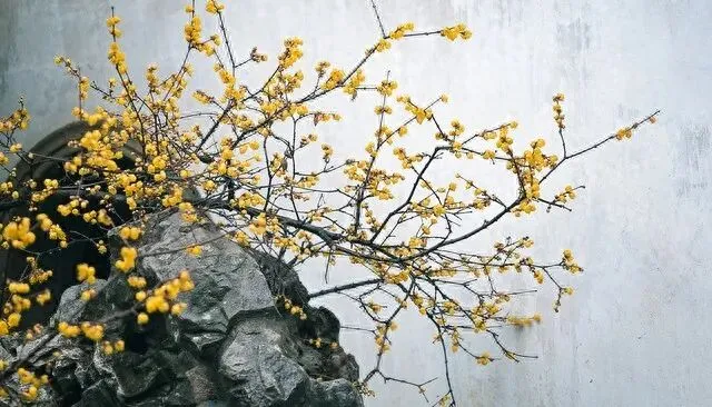 在怪石嶙峋之间,腊梅傲然绽放,金黄的花朵与灰白的假山形成鲜明对比,给人一种坚韧不拔又不失优雅的感觉。