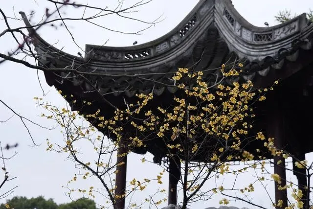风到月来亭,竹外一枝轩,腊梅的花香与古朴的建筑相得益彰,为这座精致小巧的园林增添了几分韵味。