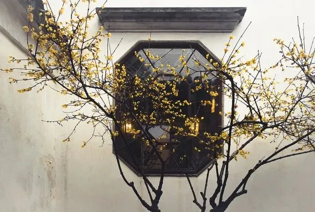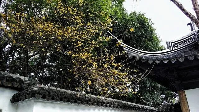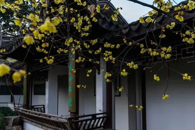 留园:留园外,高高的白墙上探出了一枝枝精巧的蜡梅花枝,而园内东西花园更是明黄满树,香气怡人。