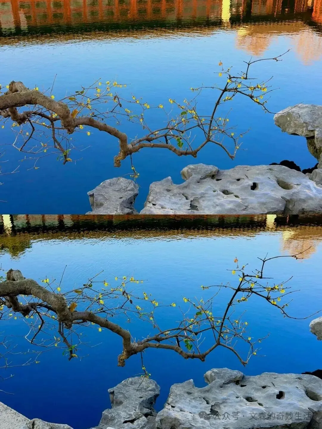艺圃蓝调临水腊梅,金黄的腊梅依水而植,倒影在园林湛蓝的池水中,与白墙黛瓦、曲折水廊共同构成一幅静谧的古典画卷。