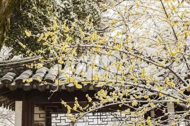 当腊梅盛开时,与周围的亭台楼阁、山水植物相互映衬,形成一幅美丽的画面。