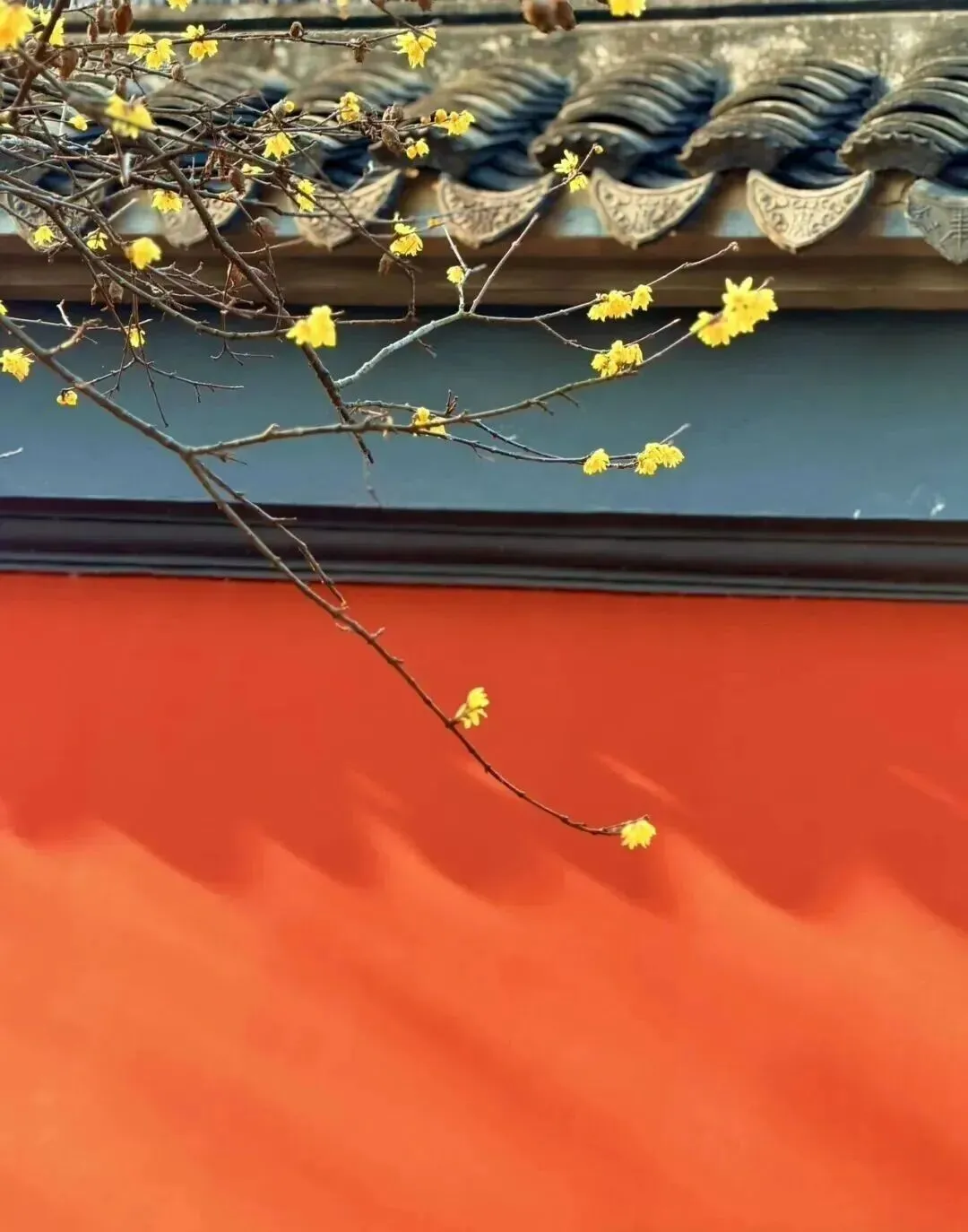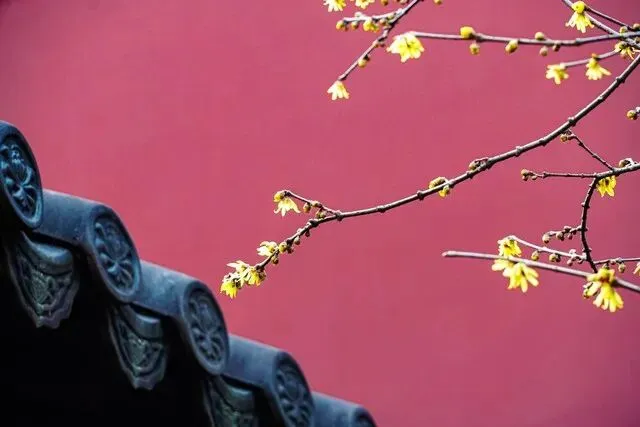 大殿后面的腊梅与黄色的墙壁相互映衬,营造出一种庄严而又温馨的氛围。在这里赏梅,不仅能感受自然之美,更能体会到心灵的宁静。