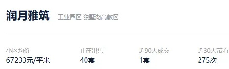 根据贝壳信息显示,润月雅筑目前40套挂牌出售,挂牌均价67233元/平。