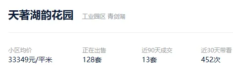 根据贝壳信息显示,天著湖韵花园目前128套挂牌出售,挂牌均价33349元/平。