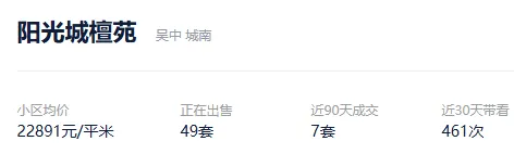 根据贝壳信息显示,阳光城檀苑目前49套挂牌出售,挂牌均价22891元/平。
