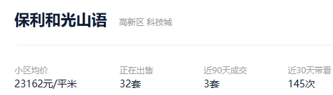 根据贝壳信息显示,保利和光山语目前32套挂牌出售,挂牌均价23162元/平。