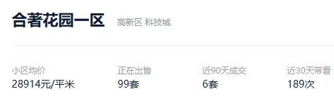 根据贝壳信息显示,合著花园一区目前99套挂牌出售,挂牌均价28914元/平。