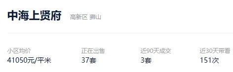 根据贝壳信息显示,中海上贤府目前37套挂牌出售,挂牌均价41050元/平。