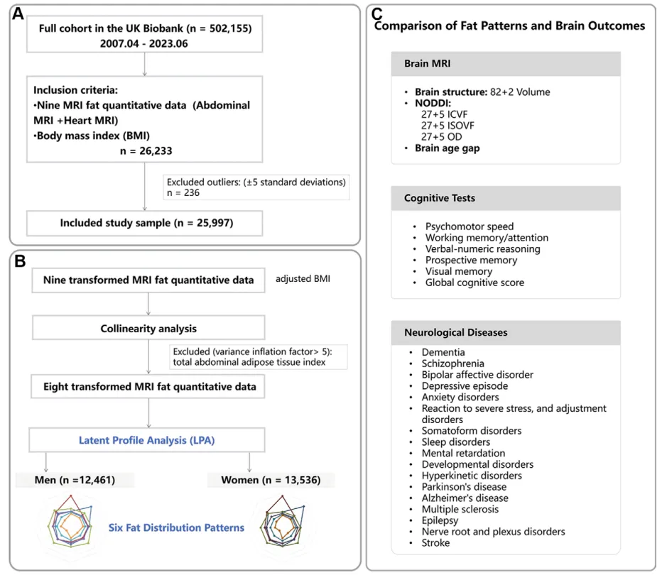 本研究通过创新的数据驱动方法,成功揭示了体脂分布模式与神经健康之间存在清晰且重要的联系。它证实了评估肥胖对大脑影响时,考虑脂肪具体分布位置的必要性,超越了传统BMI的局限。研究成果为早期识别神经系统疾病高风险人群提供了新的视角和潜在的生物标志物,对促进精准预防和健康管理具有积极的指导意义。