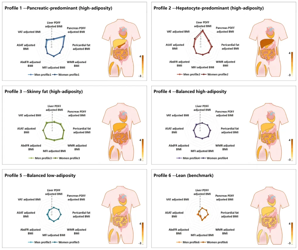 2️⃣脂肪分布模式识别: 使用潜在剖面分析(LPA),基于8个经BMI调整后的MRI脂肪指标,分别对男女性进行数据驱动的分型。