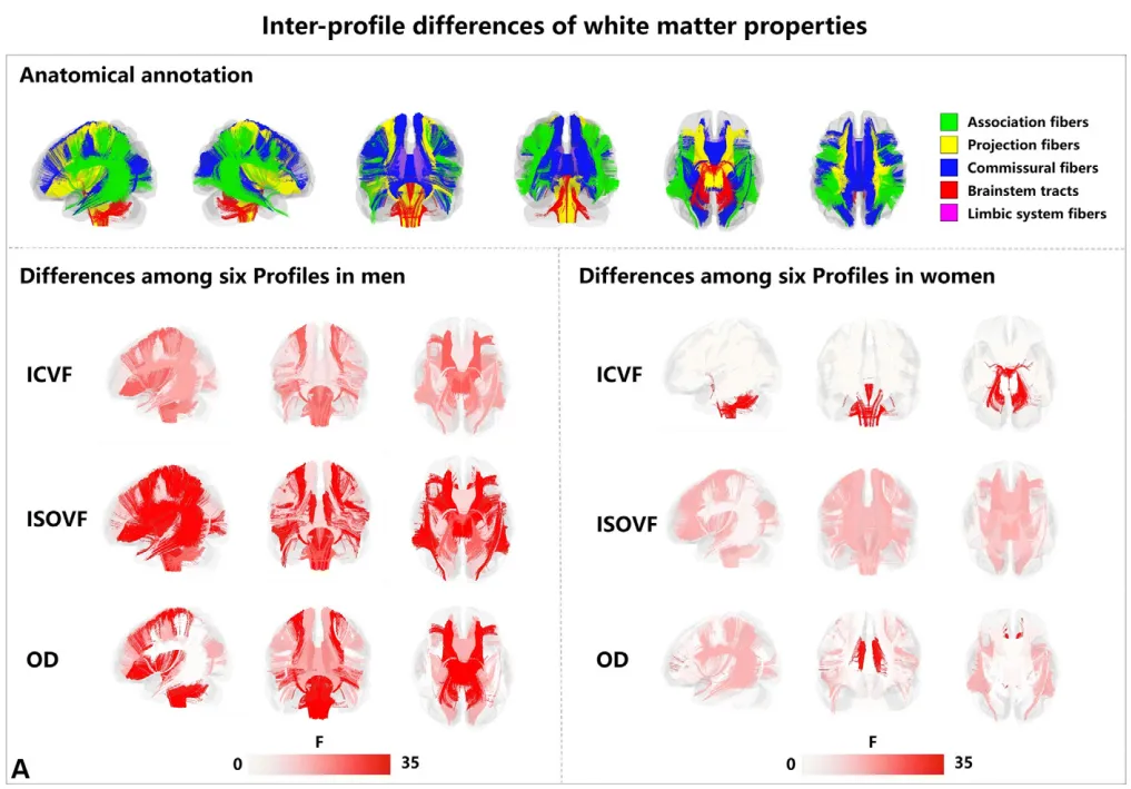 协方差分析显示,不同脂肪分布亚型与脑结构指标存在广泛显著差异。与偏瘦型相比,高脂型亚型普遍表现为全脑及灰质体积减少、白质高信号增加,其中胰腺优势型和男性瘦胖型灰质萎缩最显著。白质微结构改变及脑龄差在男性中尤为明显,呈现显著性别差异(图3)。