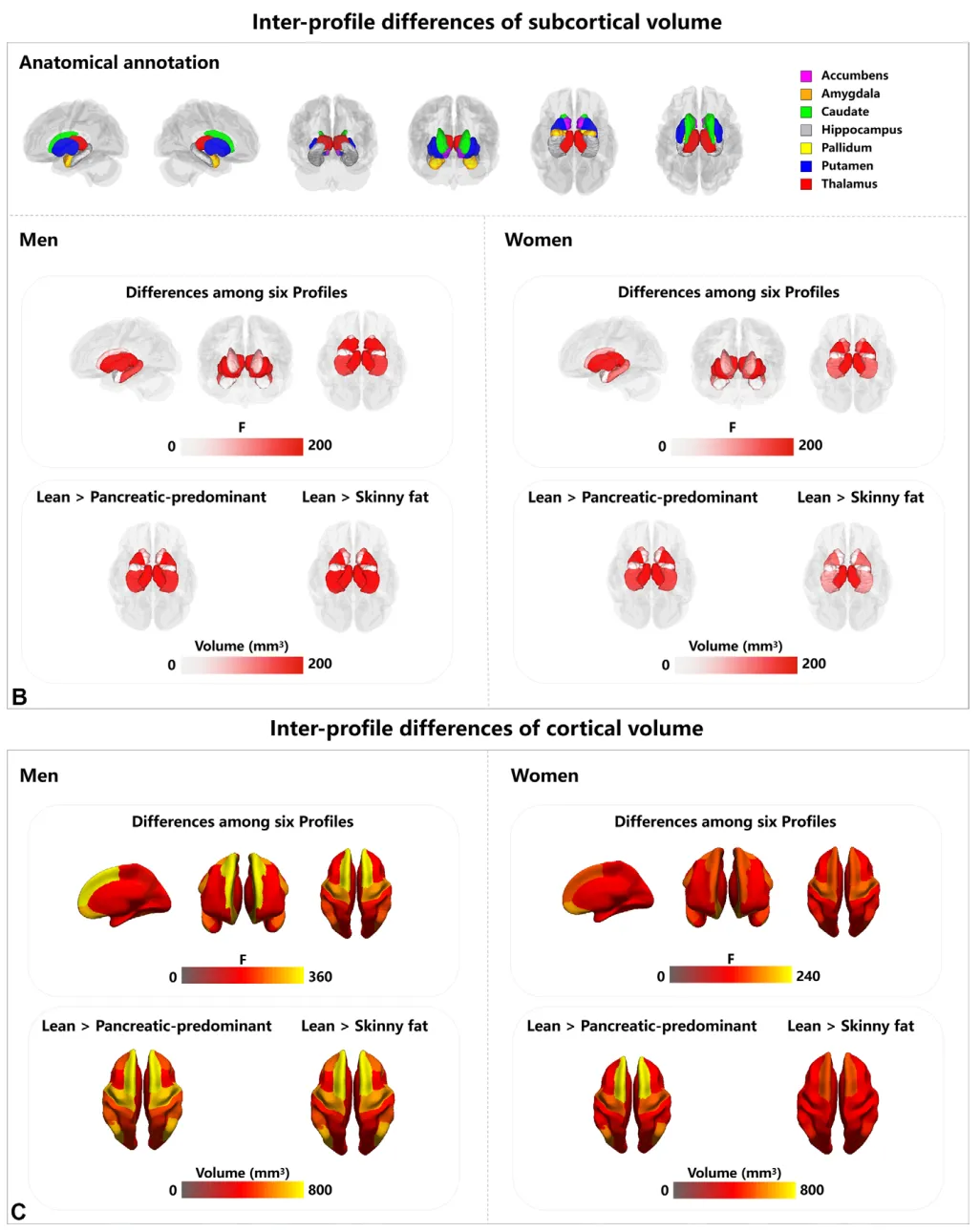 潜在剖面分析识别出六种体脂分布亚型,包括胰腺优势型、肝脏优势型、瘦胖型、均衡高/低体脂型及偏瘦型。其中胰腺优势型与瘦胖型脂肪分布模式与广泛的脑灰质萎缩、认知功能下降及神经系统疾病风险增加显著相关(图2)。