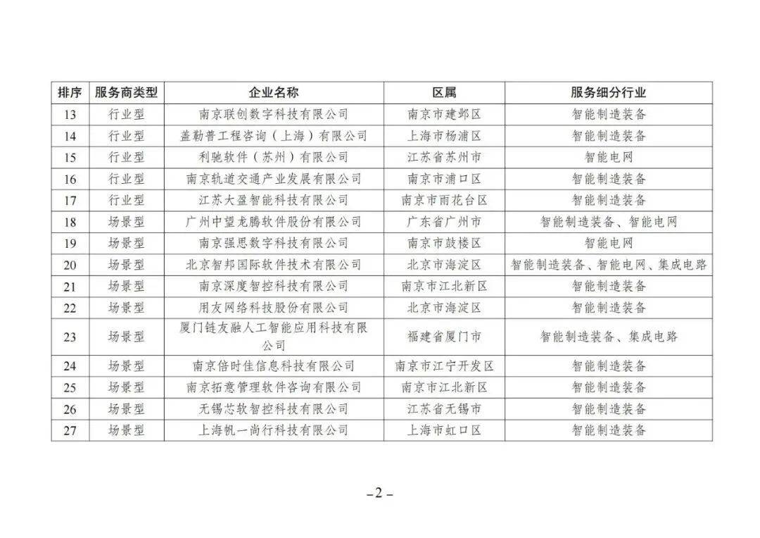 关于对南京市中小企业数字化转型城市试点数字化服务商(第二批)的公示根据《市工信局关于组织开展南京市中小企业数字化转型城市试点数字化服务商(第二批)征集工作的通知》(宁工信〔2025〕98号),经单位自主申报、区级工信部门审核推荐(南京市内)、形式审查、信用审查、专家评审、综合评定等程序,现将拟入选名单予以公示,请社会各界监督。公示期为2026年1月30日至2月5日。如有异议,请在公示期内将意见反馈至南京市工业和信息化局(请注明单位名称或自然人姓名、手机号码、异议理由并附证据)。联系电话:025-68788795(业务咨询)、025-68788856(机关纪委),通信地址:江苏省南京市建邺区江东中路265号新城大厦17F,电子邮箱:527766641@qq.com。附件:南京市中小企业数字化转型城市试点数字化服务商(第二批)公示名单