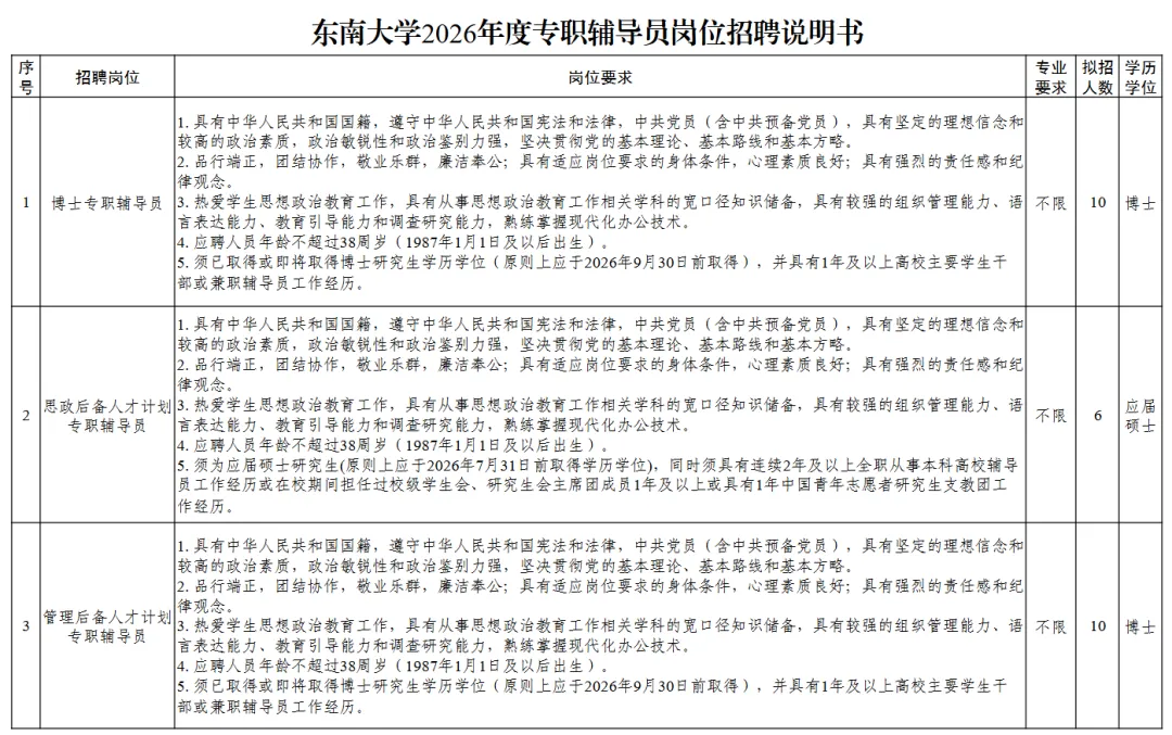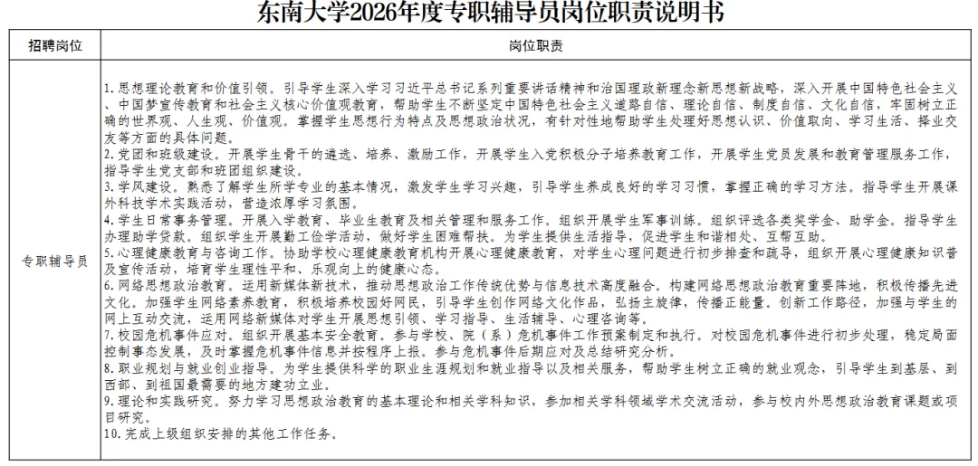 具体岗位职责及要求详见《东南大学2026年度专职辅导员岗位招聘说明书》,见附件。