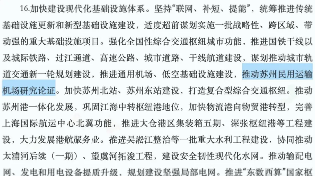 1月21号,苏州市委十五五规划建议全文予以公布,在基础设施建设那一块,推动苏州民用运输机场研究论证这句话再度出现。需要留意的是,依旧是研究论证,并非立项,更不是开工。