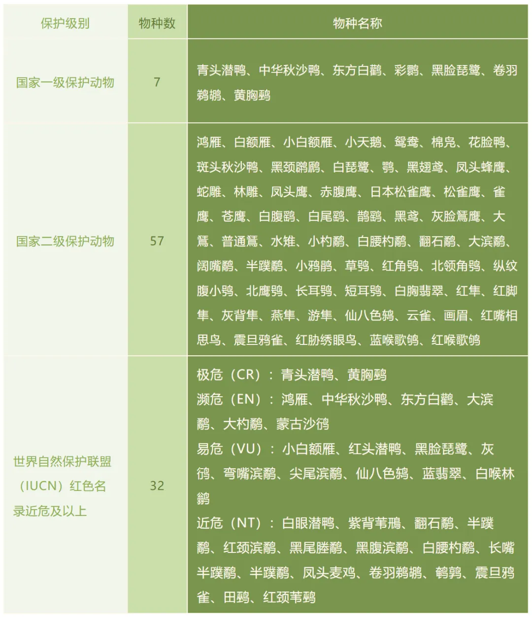 2025年发现的国家一级保护动物有7种,国家二级保护动物有57种。