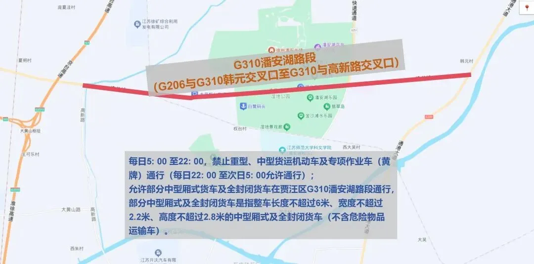 自2026年2月1日至2027年1月31日对贾汪区G310潘安湖路段(G206与G310韩元交叉口至G310与高新路交叉口)实行交通限制,每日5: 00 至22: 00,禁止重型、中型货运机动车及专项作业车(黄牌)通行(每日22: 00 至次日5: 00允许通行);允许部分中型厢式货车及全封闭货车在贾汪区G310潘安湖路段通行,部分中型厢式及全封闭货车是指整车长度不超过6米、宽度不超过2.2米、高度不超过2.8米的中型厢式及全封闭货车(不含危险物品运输车);道路养护、维修、保洁和执行任务的消防车、工程救险车、应急救援车及运输鲜活农副产品的车辆不受上述限制;其他确需在以上路段通行的车辆,可在手机下载交管12123 APP 办理相关通行手续。